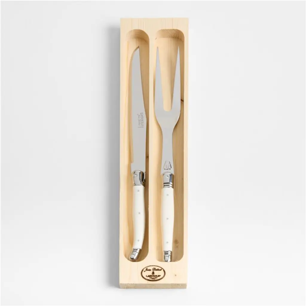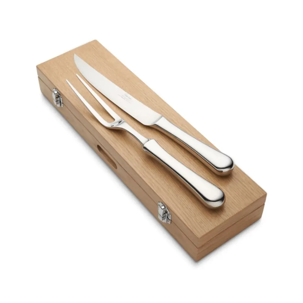 This two-piece carving set is a great addition to our bestselling, classically styled Caesna flatware collection designed by Robert Welch Designs in the English Cotswolds. Made of forged stainless steel, the knife and long-tined fork are well balanced and comfortable in hand and come packaged in a handsome wood storage box.