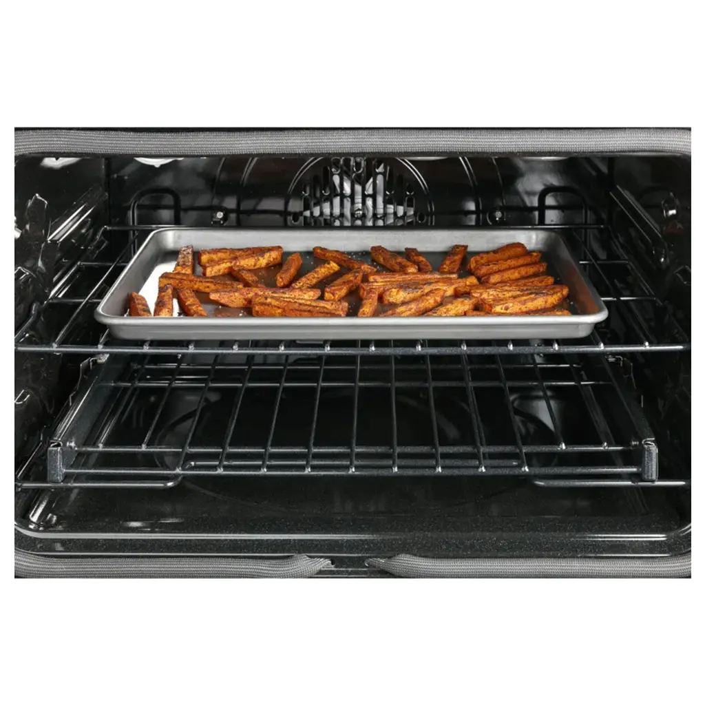 Explore your love of entertaining. This Dual Fuel slide-in range unites the power of a gas cooktop with the precision of an electric oven. The industry’s first edge-to-edge cooktop with six versatile burners also includes an integrated griddle to easily handle large meals and family favorites. And a double oven lets you prepare different foods at different temperatures at the exact same time.