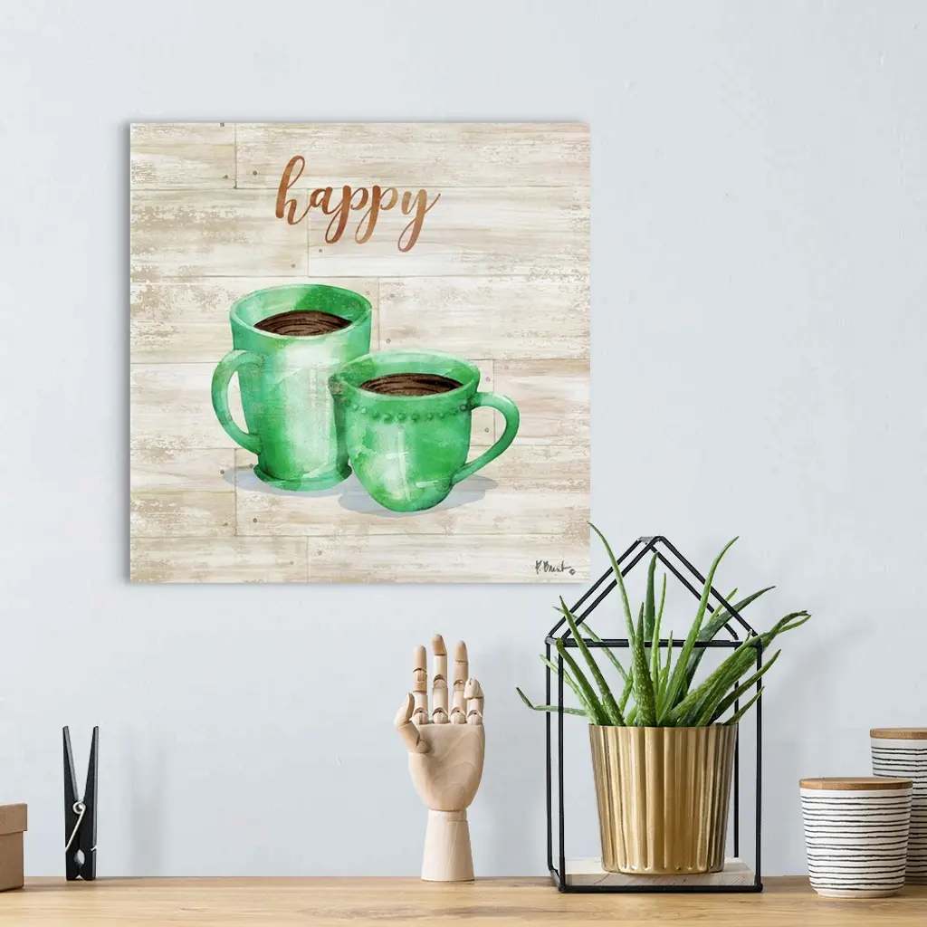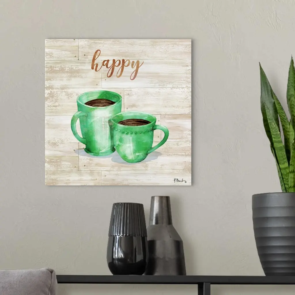 Square decor with two mugs of coffee on a faux wood background with "happy" written at the top.