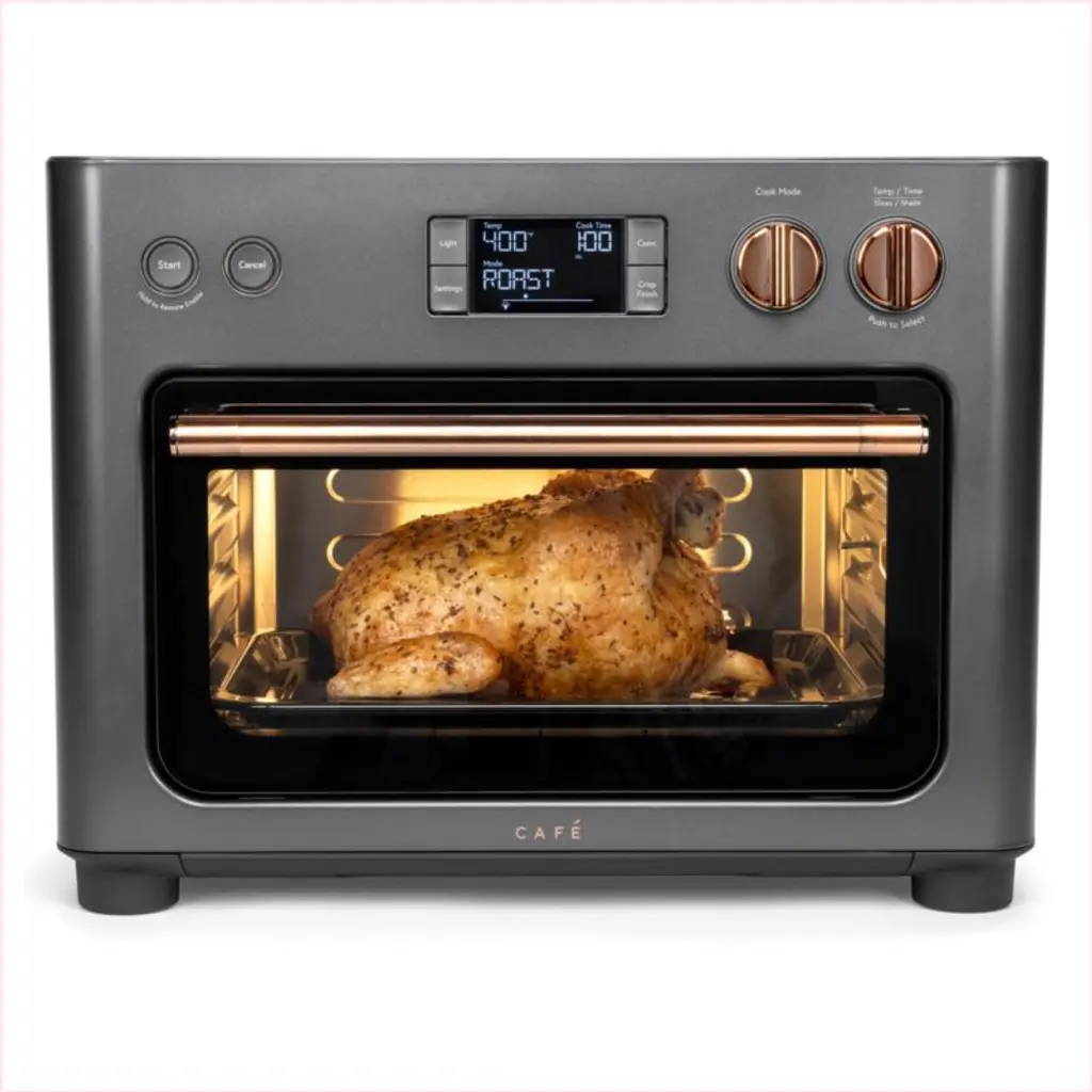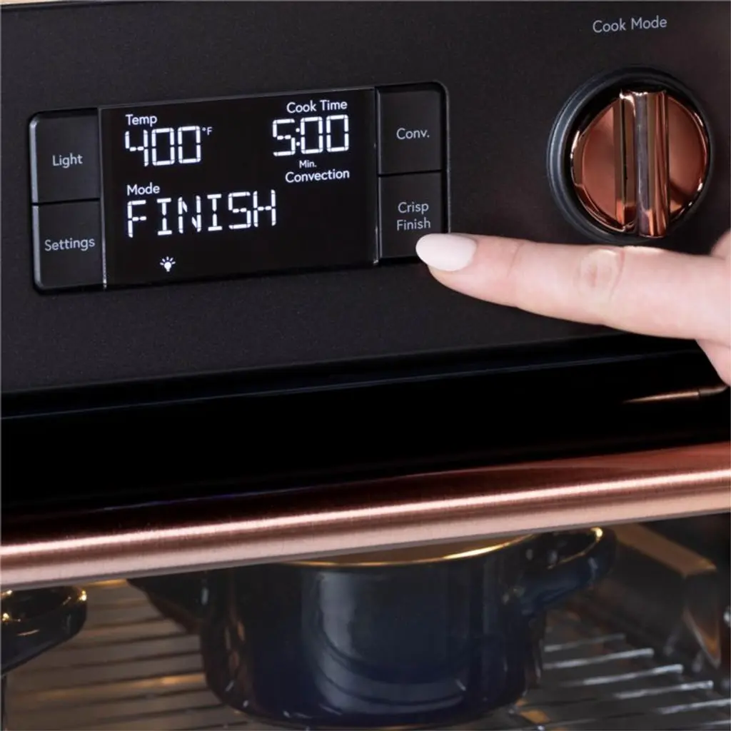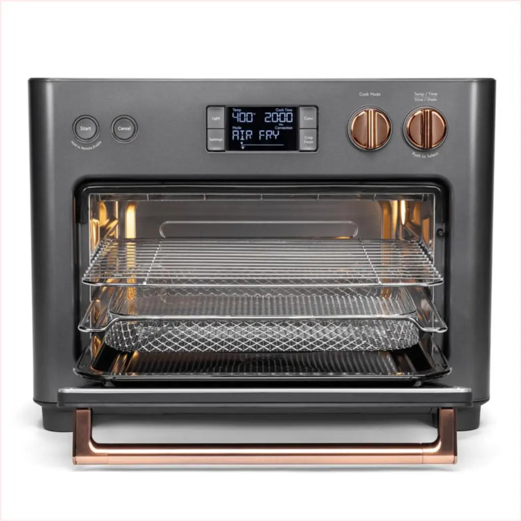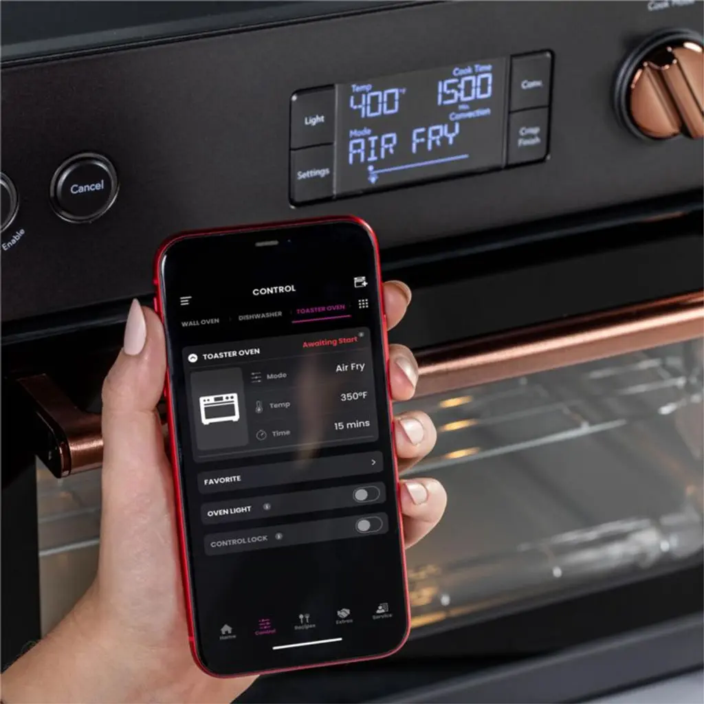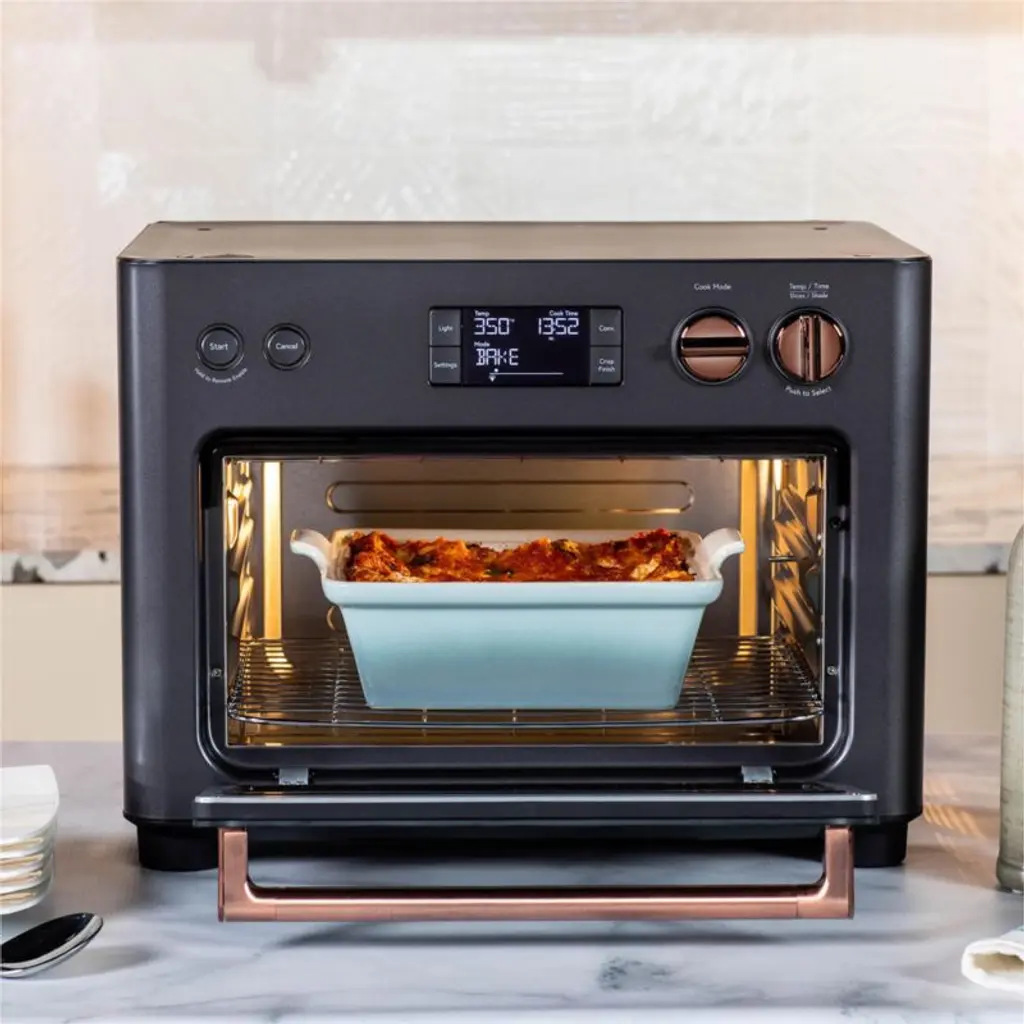 Adorn your counter with this handsome combination toaster oven and air fryer. Accented in rosy brushed copper, the matte black appliance not only graces the kitchen with a sleek silhouette, a modern palette and glam details. It also boasts fourteen cooking modes and a large temperature range that allow you to proof dough, dehydrate fruit and slow cook at low temps as well as bake pizza, roast vegetables and air fry appetizers at high heat. The rapidly heating appliance also serves as a toaster with dedicated bagel and toast functions. To give everything you make the perfectly browned and crispy finishing touch, use the Crisp Finish option. Control the WiFi-connected smart appliance remotely with the SmartHQ app or by voice using your home device. This generous capacity air fryer/toaster oven includes an oven rack, non-stick pizza pan, non-stick baking pan and wire-mesh basket.