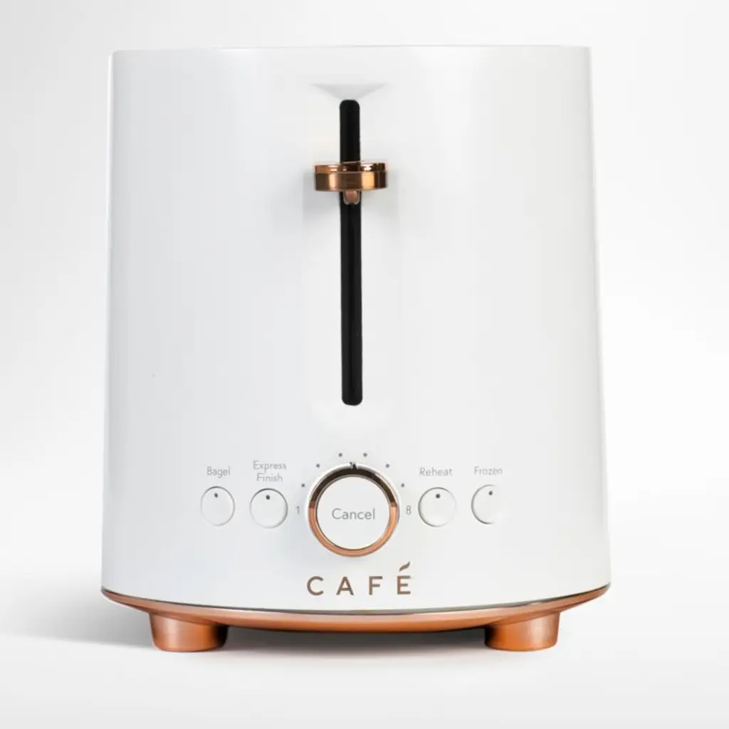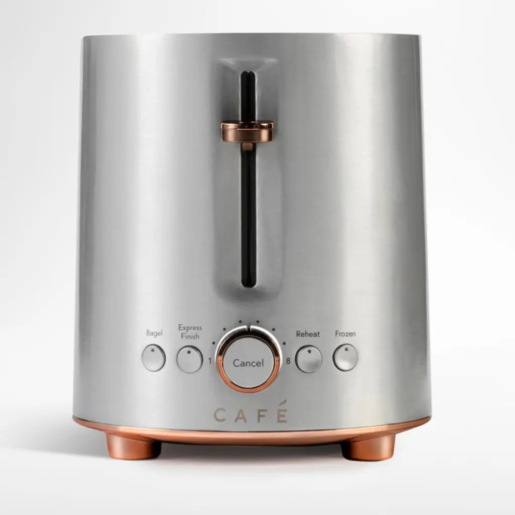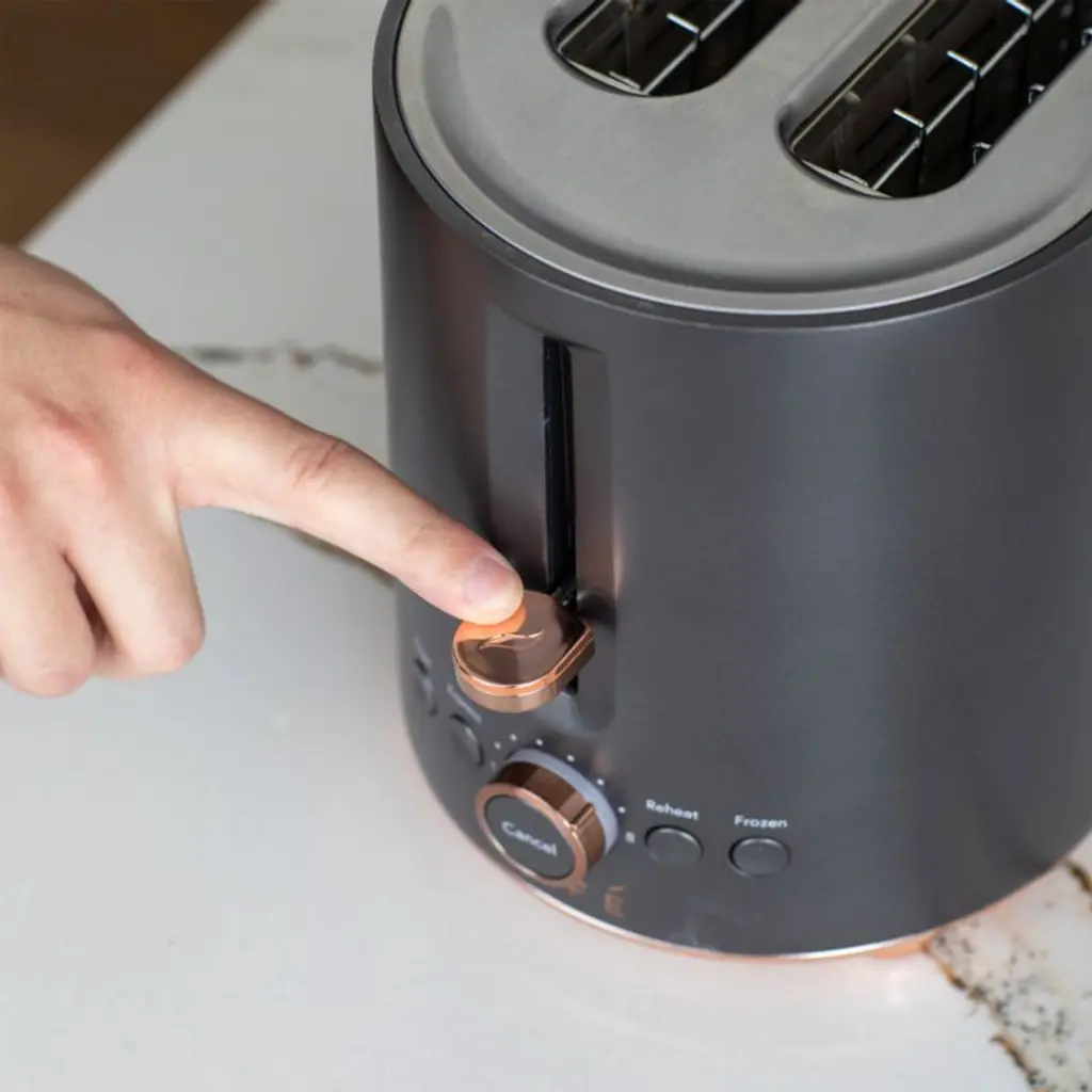 Adorn your counter with this handsome toaster. Accented in rosy brushed copper, the matte black toaster graces the kitchen with a sleek silhouette, modern palette and glam details. Eight shade options ensure each slice is browned exactly to your liking, and the Express Finish mode creates your ideal toast in just a minute for breakfasts-on-the-go. The extra-side slots accommodate frozen Belgian waffles, slices of artisan bread and bagelsthe unique Bagel function toasts the cut side while keeping the outside soft. Glowing gently, the white LED light ring indicates the status of your toast and blinks when it is ready.
