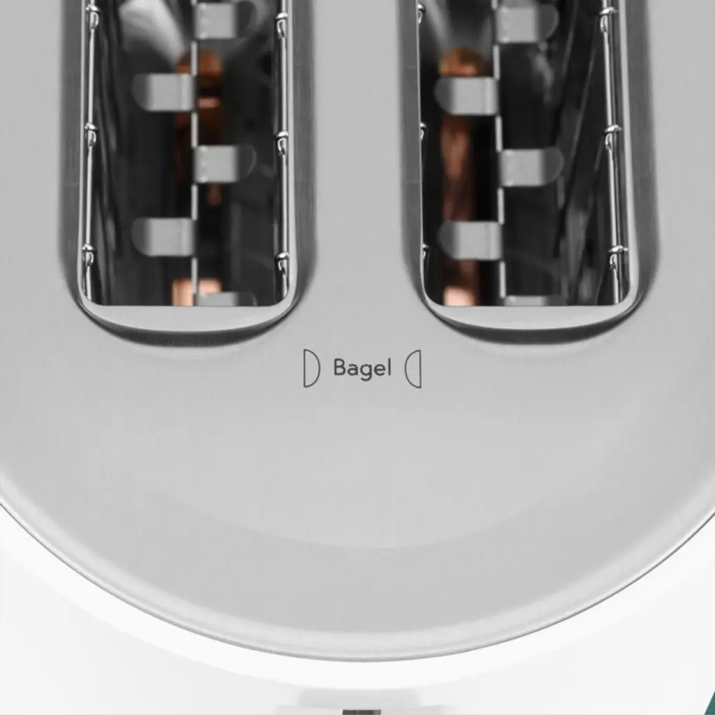 Adorn your counter with this handsome toaster. Accented in rosy brushed copper, the matte white toaster graces the kitchen with a sleek silhouette, modern palette and glam details. Eight shade options ensure each slice is browned exactly to your liking, and the Express Finish mode creates your ideal toast in just a minute for breakfasts-on-the-go. The extra-side slots accommodate artisanal slices, frozen Belgian waffles and bagelsthe unique Bagel function toasts the cut side while keeping the outside soft. Glowing gently, the white LED light ring indicates the status of your toast and blinks when it is ready.