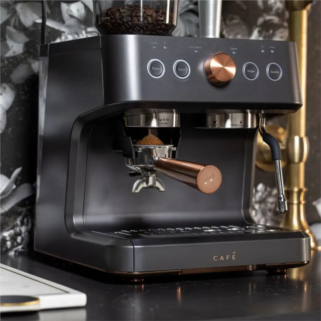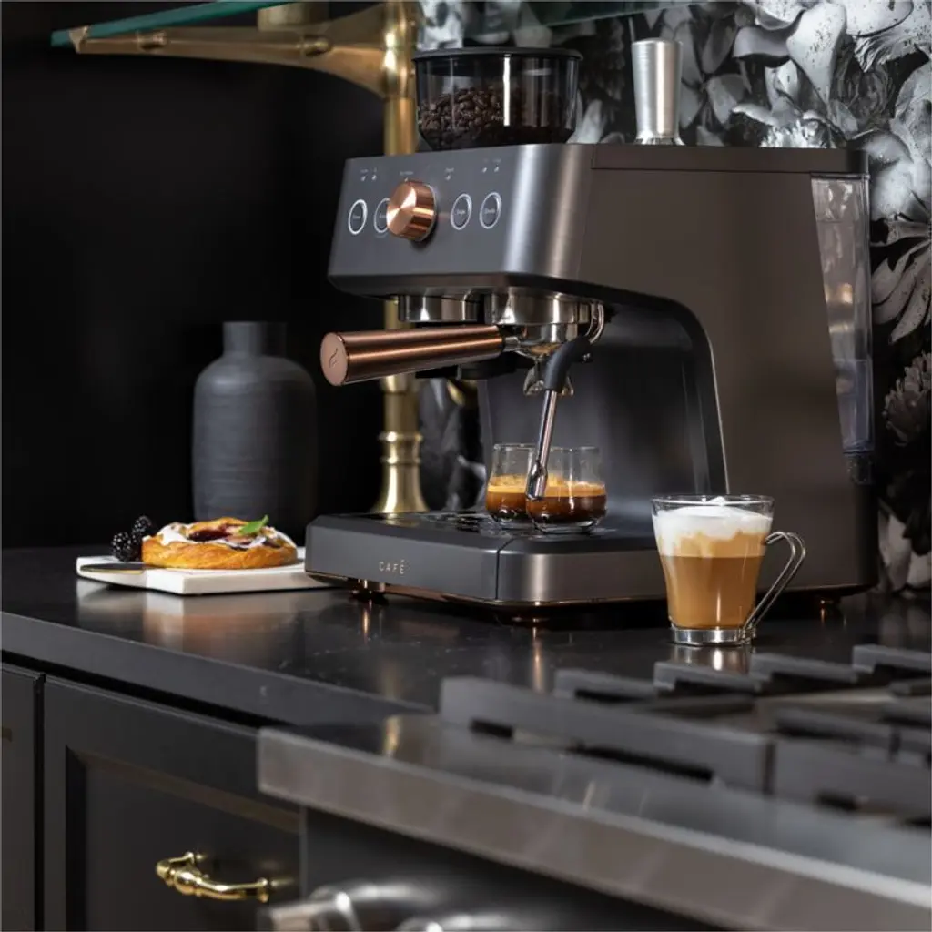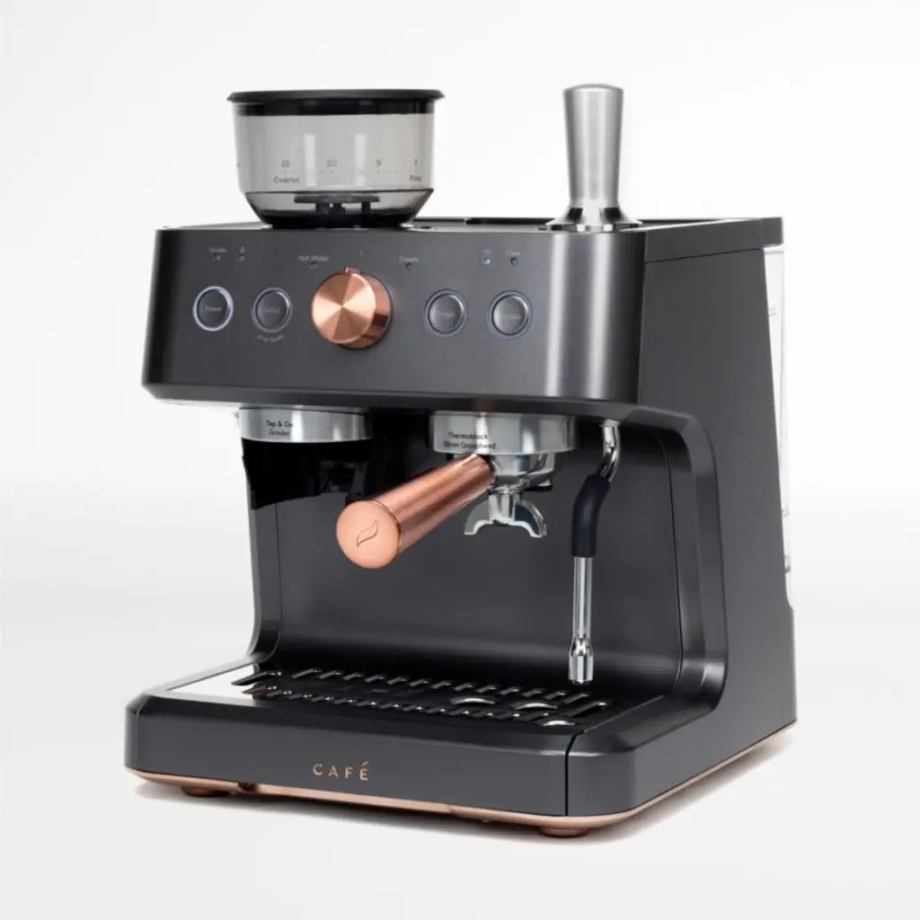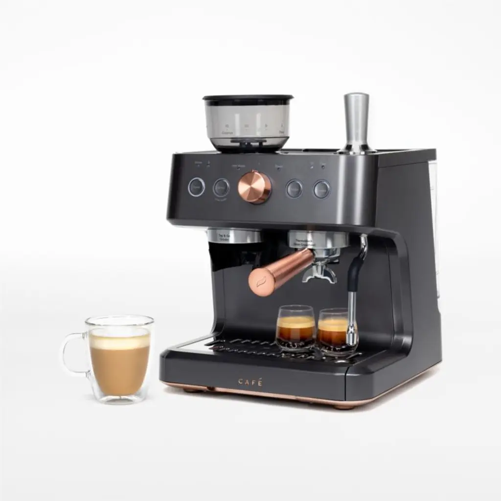 Adorn your counter with this handsome machine designed to deliver exceptional espresso. The built-in grinder offers 15 grinding levels and doses grounds directly into the portafilter, while the steam wand rotates 180 degrees to create cafe-quality microfoam with ease. WiFi enabled, the smart espresso maker syncs with the custom app to customize drinks to your preferred volume and strength. Accented in rosy brushed copper, the matte black machine graces the kitchen with a classic look, modern palette and glam details.View all Cafe Appliances