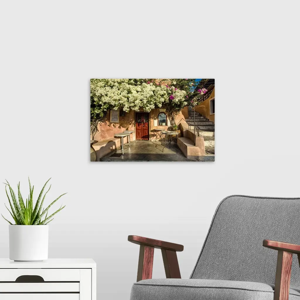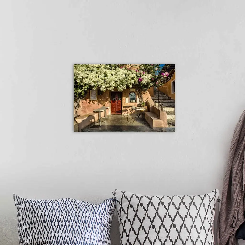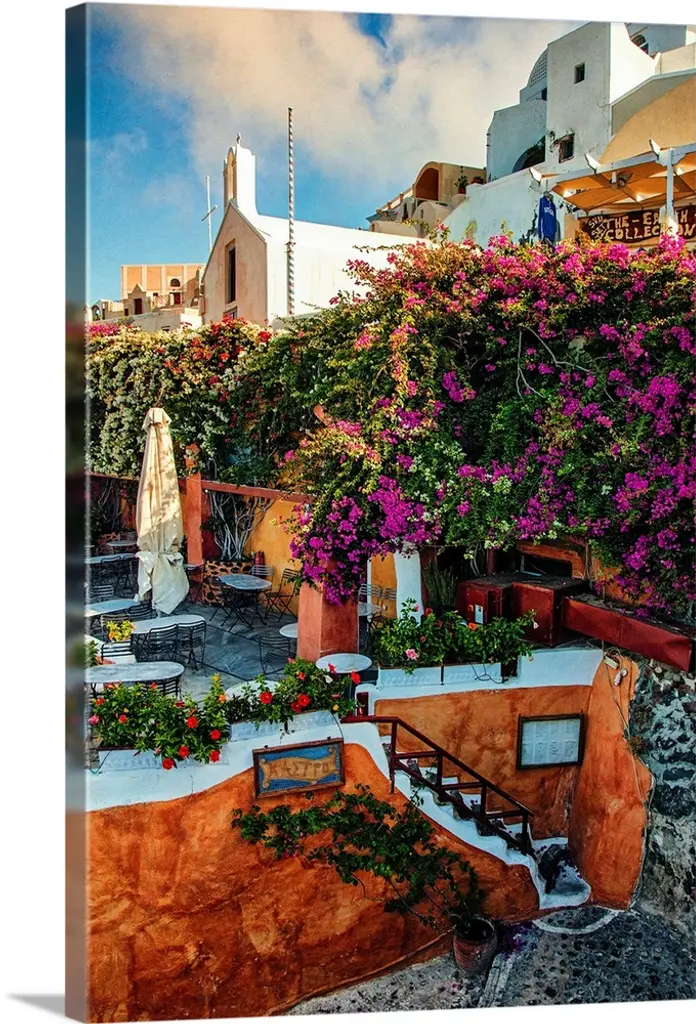 Cafe With Bouganvillea In Oia, Santorini, Greece