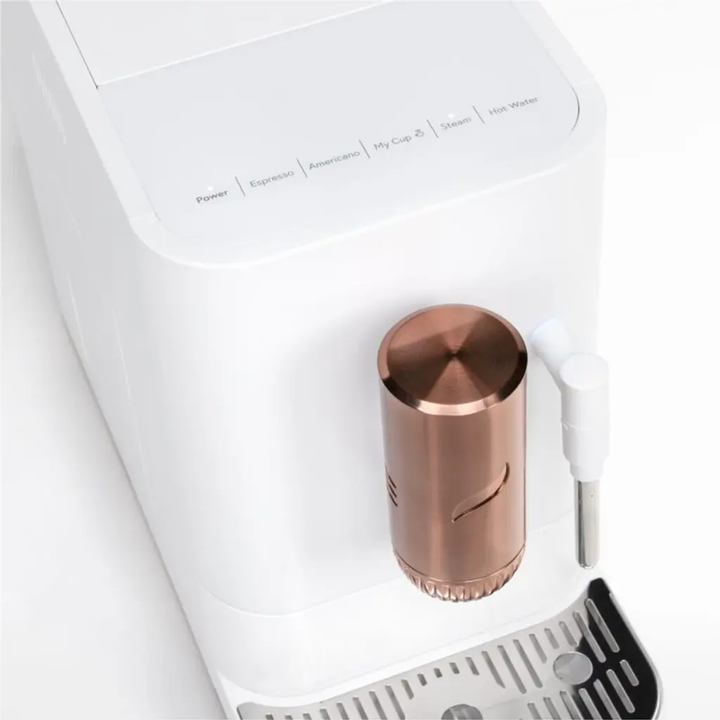 Adorn your counter with this handsome machine designed to deliver exceptional espresso. The built-in grinder offers five grinding levels, and the pre-infusion feature extracts the optimal flavor from your coffee grounds. With the push of one button, the AFFETTO dispenses espressos, Americanos, hot water or My Cup beveragesuse the app to customize the My Cup option exactly to your preferencesand the steam wand froths milk for creating flat whites, cappuccinos, lattes and cafe au laits. Accented in rosy brushed copper, the matte white machine graces the kitchen with a compact footprint, sleek silhouette, modern palette and glam details.