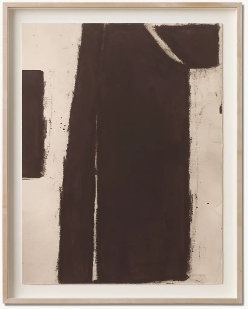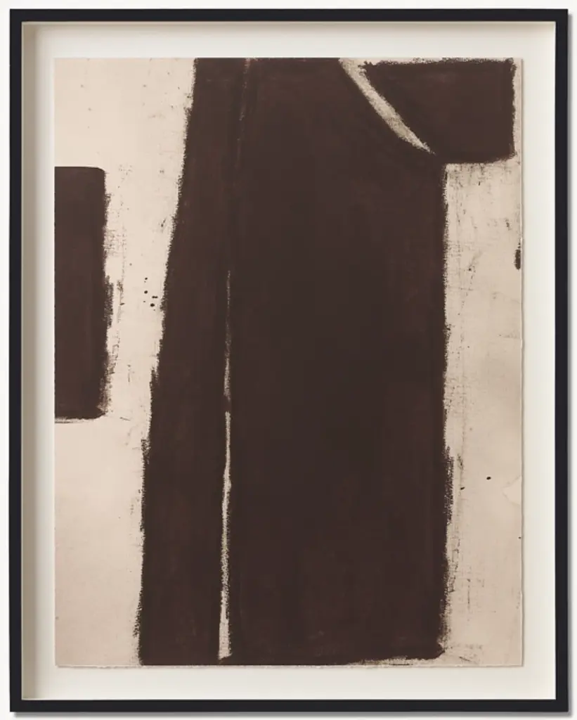 Recalling the spartan beauty of 1950s Brutalist architecture, Caitlin Dinkins & Minh Nguyen's series is marked by bold brushwork and a graphic color scheme. The ivory ground is layered with velvety black shapes – detached, yet seemingly in dialogue with one another. Their abstract geometry and uneven contours are at once powerful and poetic.