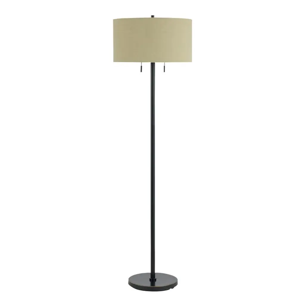 Contemporary and statuesque, the two-light Calais floor lamp offers brilliant style and diffused light to the living room or bedroom. Featuring dual pull-chain switches and a dark bronze finish, this tall studio lamp tops off its look with a chic beige linen shade.