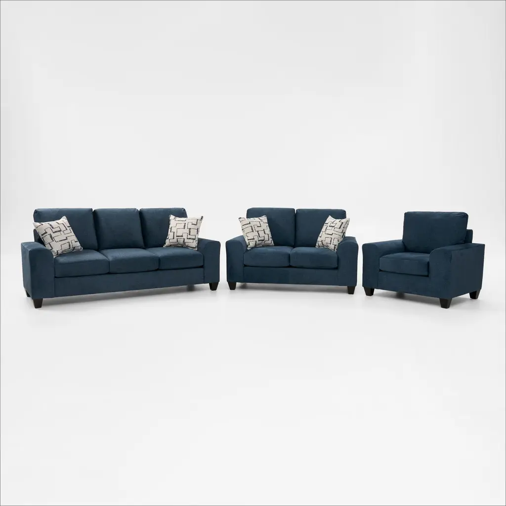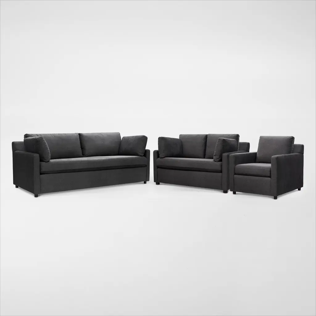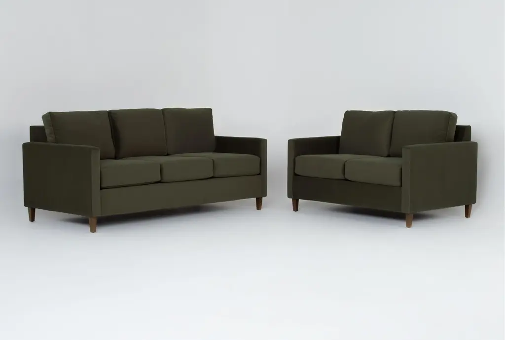 Fans of ease and simplicity will be impressed with the sleek, streamlined nature of our Calais living room set, which is designed and made exclusively by Living Spaces. Track arms and tailored frames create a sense of sophistication, while tapered legs point the designs in a mid-century modern direction. Loose, reversible cushions ensure even wear and longevity. Available in multiple colors, you can pick the hue that suits you and your living room best.