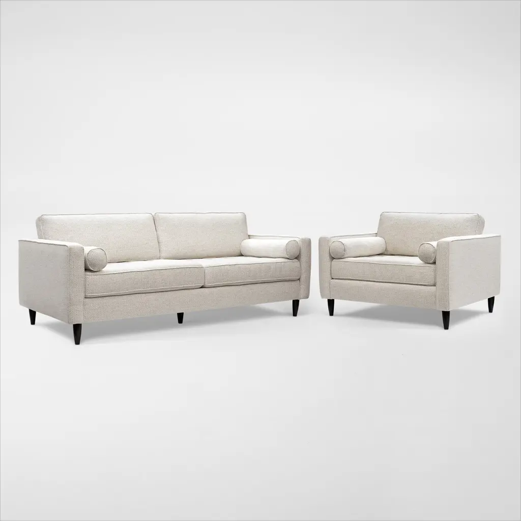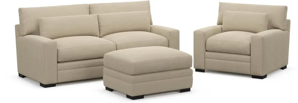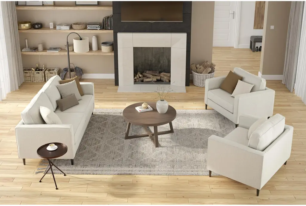 The Calais III Linen Modern 3 Piece Sofa|2 Chair Set is the perfect addition to your living room. This stylish set includes a sofa and two chairs, all upholstered in soft linen-colored fabric. The modern design and comfortable seating make it ideal for relaxing with family or entertaining guests.