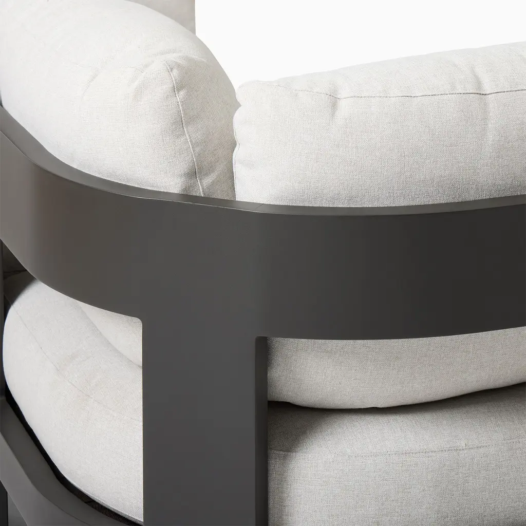 Rounded frame invites you to sit back and relax. Crafted of sleek, lightweight aluminum. Weather-resistant cushions offer cozy comfort. Contract Grade, so you know it's built to last.