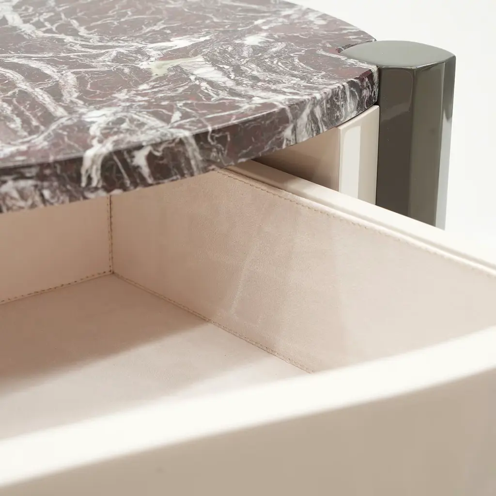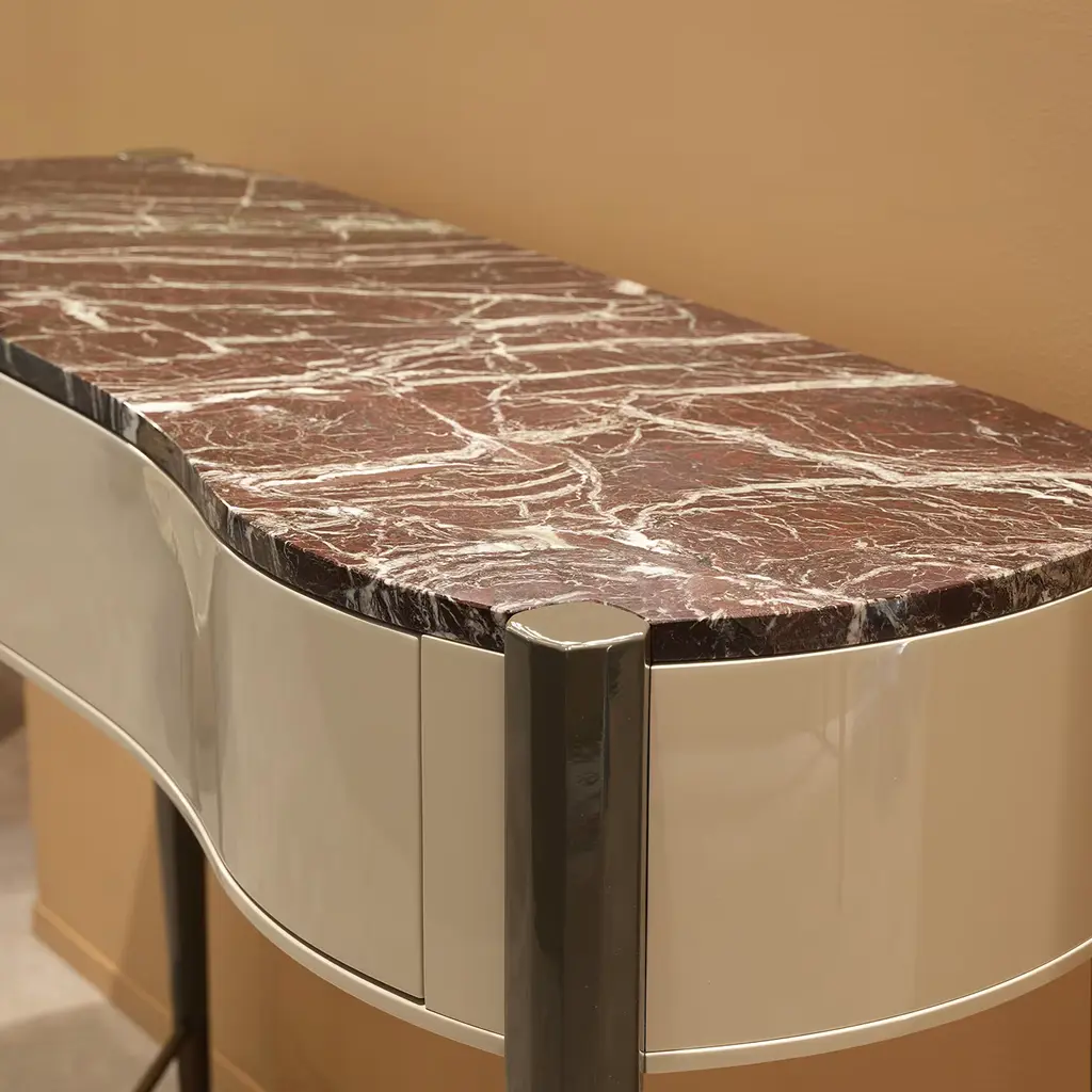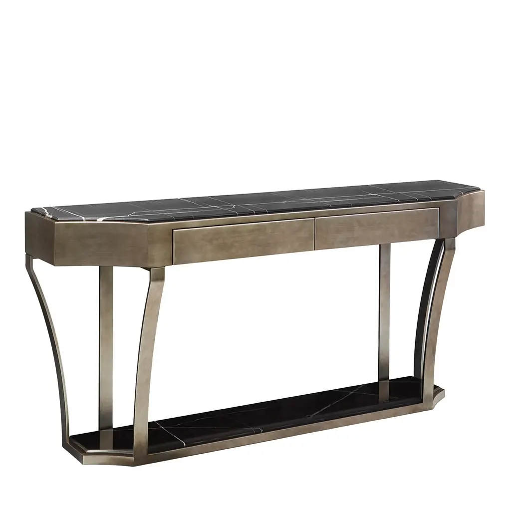 Graceful lines characterize this precious console from the Caleido Collection, a superb addition to exclusive modern-style entryways. Flaunting a lacquered wooden structure offered in a delicate gray-stone hue, it features brushed bronzed metallic elements adding a touch of elegance and lightness to the whole structure. A prized marble top is available on request to the Concierge.