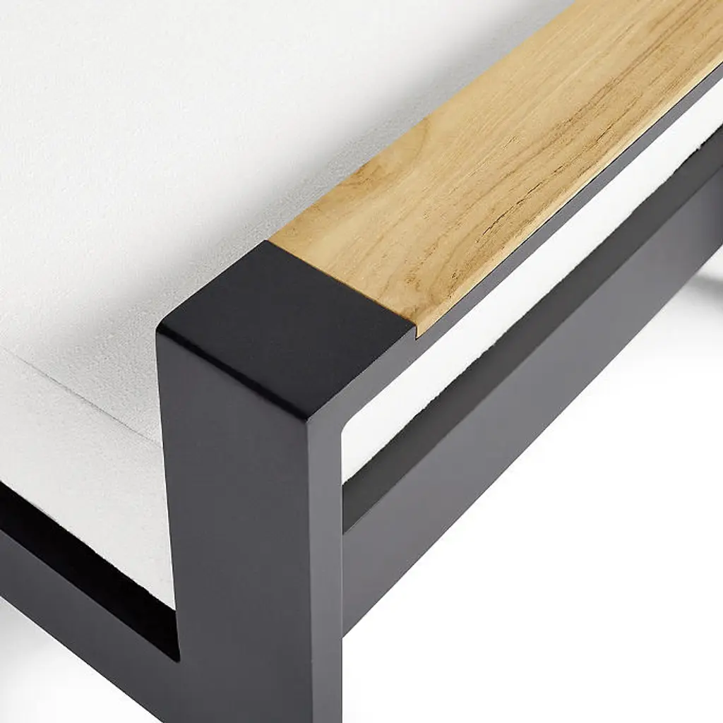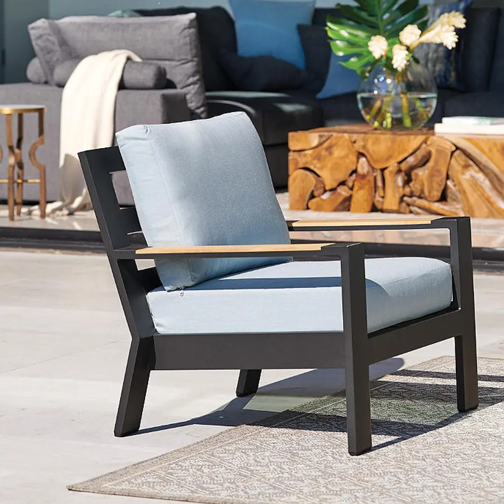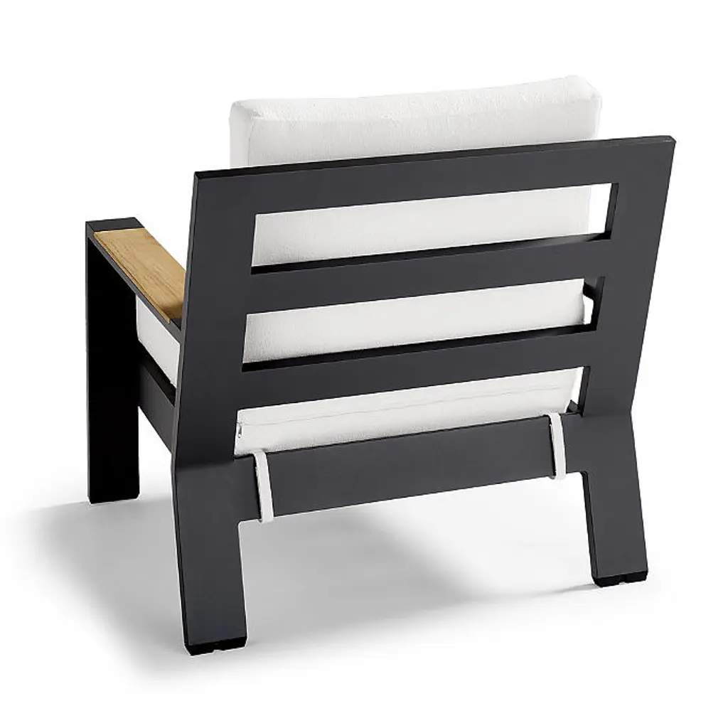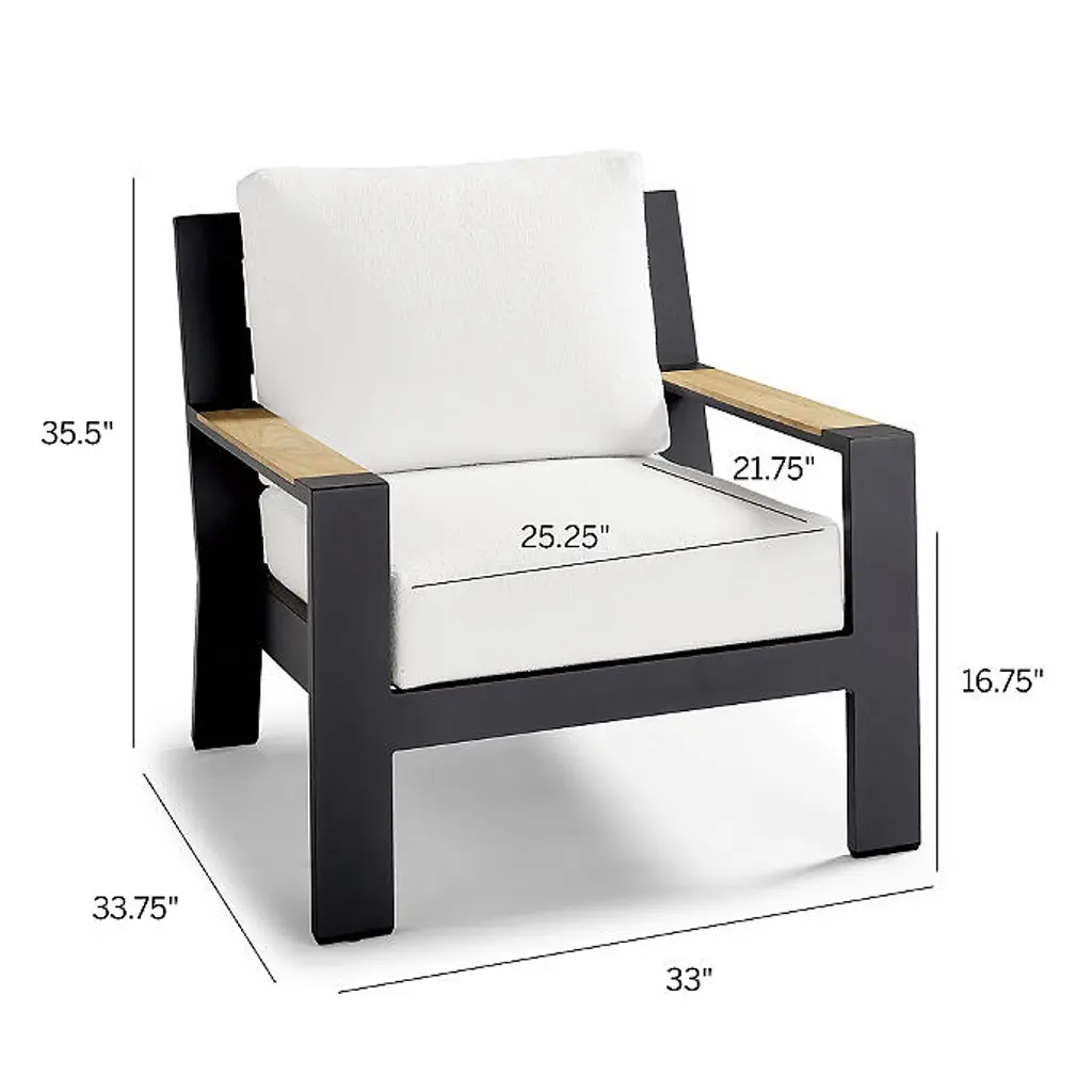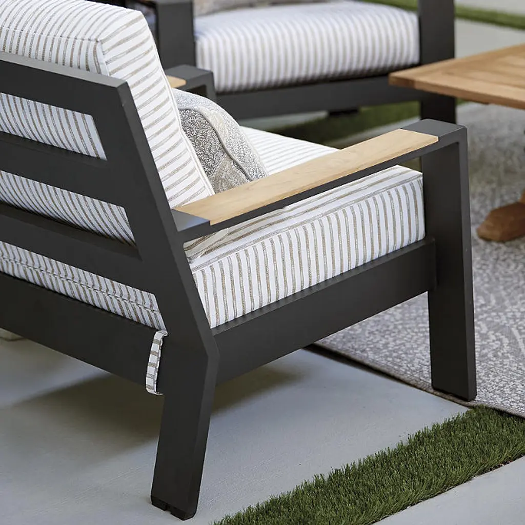 The Calhoun Lounge Chair in Matte Black Aluminum clean lines and generously sized armrests create a simple, yet classic look that elevates any outdoor space. Crafted of lightweight powdercoated aluminum with teak insets on each arm that create a unique design element. Included cushions are upholstered in 100% solution-dyed acrylic fabric.Contract-gradeDurable yet lightweight aluminum frame is finished with a protective powdercoat to resist the elementsFrame is backed by an industry-leading 10-year structural warrantyIncludes seat cushions and back cushionsAll-weather cushions have a high-resiliency foam core wrapped in plush polyester100% solution-dyed fabric resists mold, mildew and fading – and is easy to cleanMatte black finishAlso available in matte white finishArrives assembledImported A Frontgate exclusive.Type of Cushion: Standard: Multiple layers of high-resiliency, high-density foam core with soft polyester wrap.Quick Dry: Faster drainage and 35% faster dry time. Open-cell foam wrapped with densified polyester and a quick-dry center, lined for extra comfort. Removable cover has mesh panel on the bottom for maximum drainage.At Frontgate, our primary focus is quality. We guarantee that every product we sell will stand up to the supreme test – our customers' satisfaction. To learn more about our policies, visit our Shipping & Processing, Returns & Exchanges and Warranty & Price Guarantee pages.Please Note: Digital renderings are available in select fabric options. If a digital rendering is not available, we recommend ordering a swatch before completing your order. Digital renderings of custom upholstery may differ in pattern placement from the actual item. Because colors can vary from screen to screen, we recommend ordering a swatch before completing your order.We offer free swatches of all our fabrics. 10-swatch maximum. Solid and stripe swatches measure 4"x4" and pattern swatches measure 8"x8". View and order swatches here.