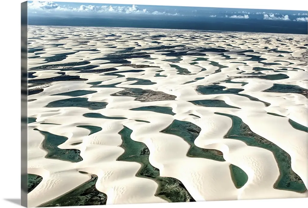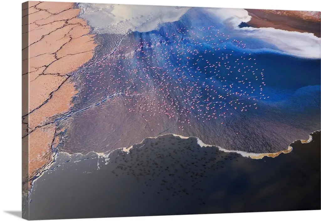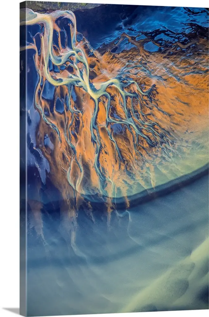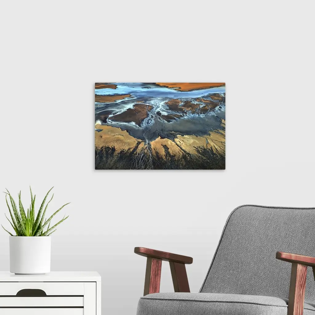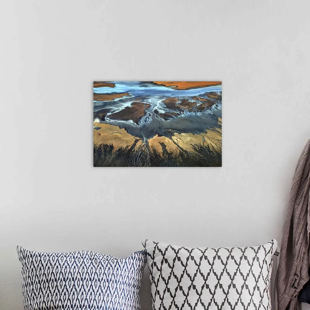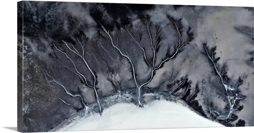 Aerial view of a desert landscape with veins of water streaming off of a main water source.