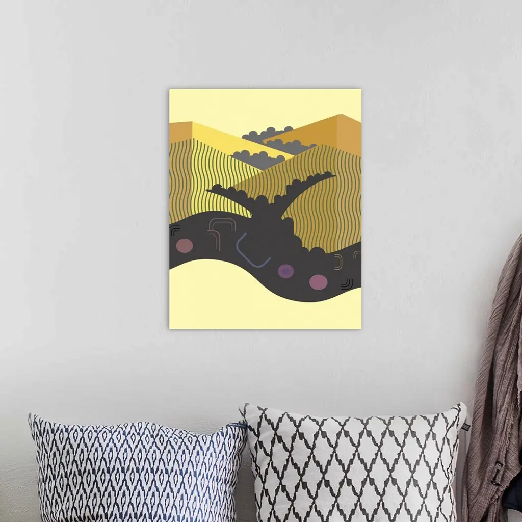 Abstract and geometric illustration of California beach and background hills.