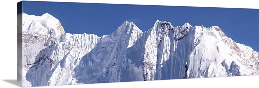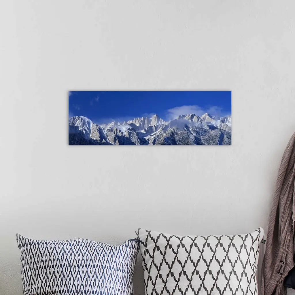 Panoramic photograph of snow covered Mount Whitney beneath a vibrant blue sky in California.