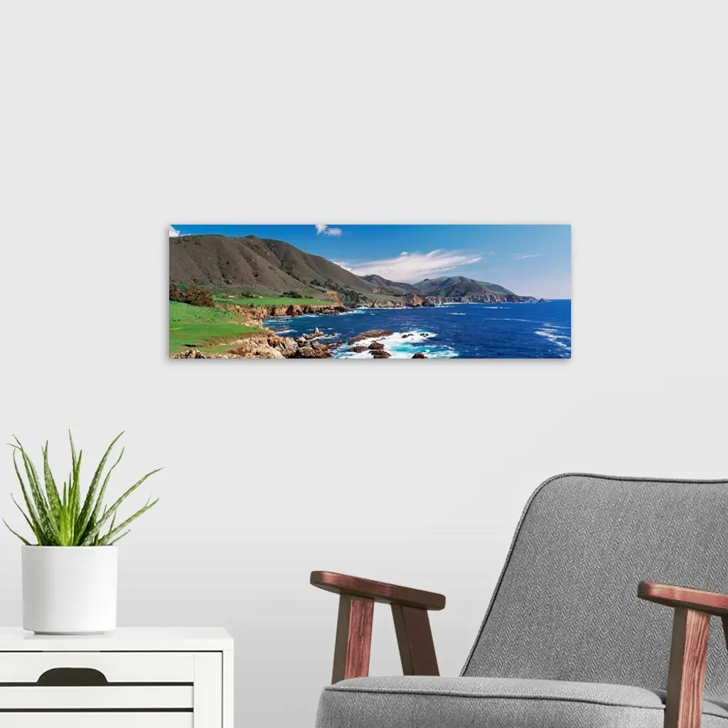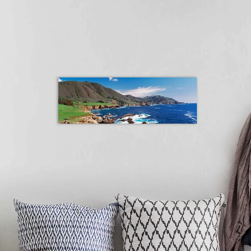 Wide angle photograph of the coastline in Big Sure, California. Hills jutting into the blue waters of the Pacific Ocean.