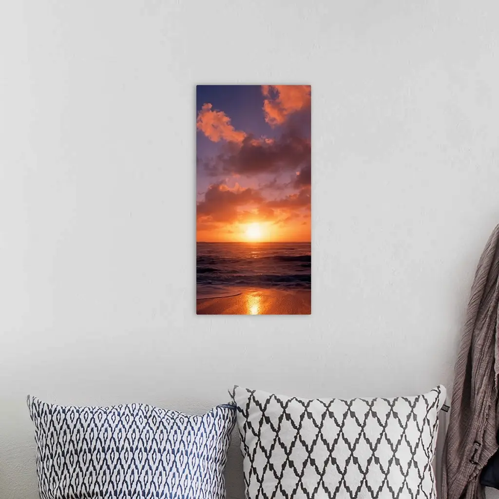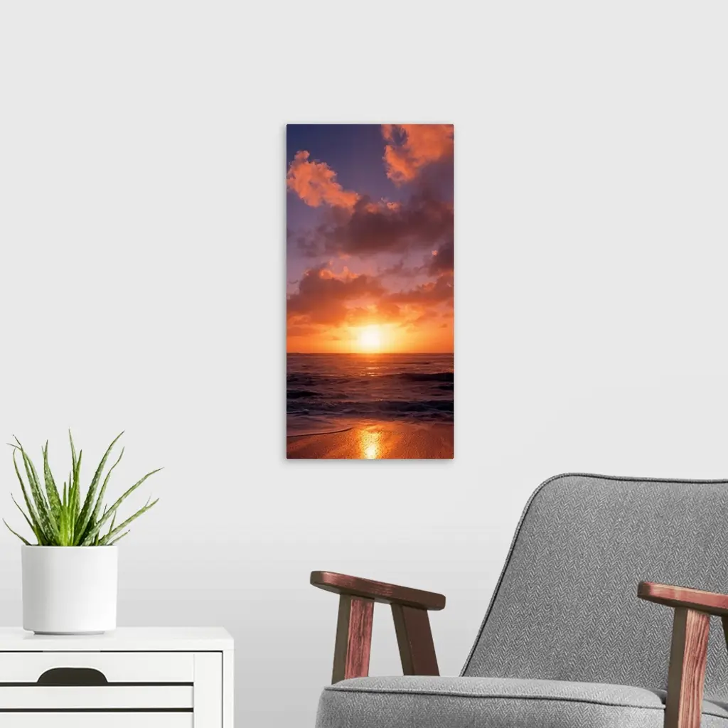 This vertical photograph shows the sun setting at the beach as waves wash against the shore.
