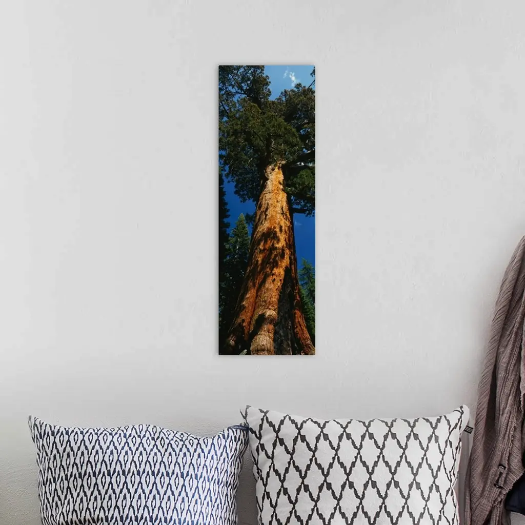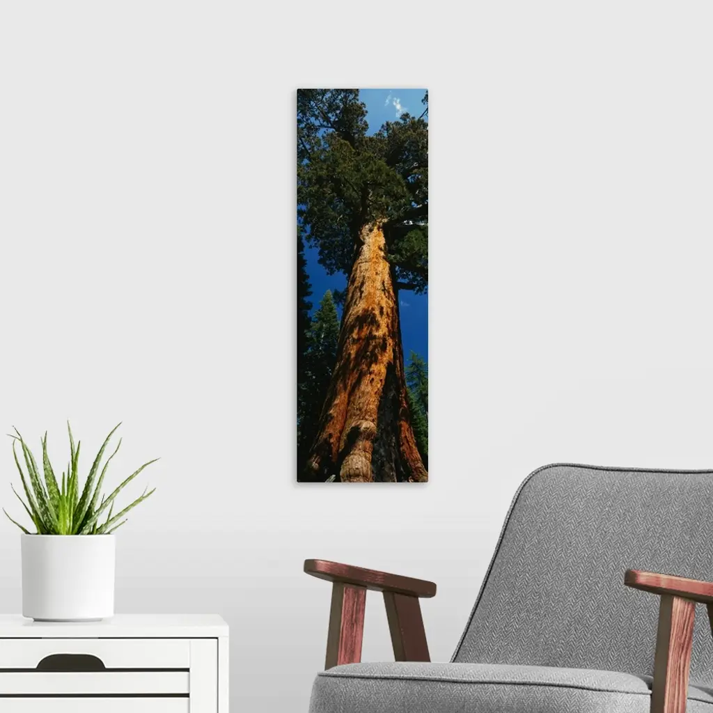 Vertical photograph on a giant wall hanging of Grizzly Giant, the large redwood sequoia in Yosemite National Park, California.