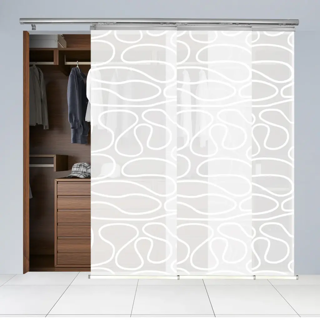 Central Design Products is pleased to introduce a new innovative panel track that offers easy 2-way installation, adding an alluring style and refined touch to your home decor. The single rail design of the track is sleek, compact, and reduces the overall footprint and weight of the installation, eliminating bulky, intrusive window treatments. Adjusting the panel height is a breeze � simply trim the panel, re-attach the liner, and install the panel weight. Detailed instructions are included.The panel track also features a patented slider design, made with aluminum and fitted with bearings that allow for durable and smooth operation. The sliders are stacked closer together than conventional panel tracks, reducing light bleed coming from the gaps between panels. This track has endless uses from dividing rooms, garages, offices, and closets to decorating windows and patios. Available in larger sizes including 8, 10, and 12 panels. Extends from 36-66� wide. Each panel measures 23.5" wide and 91.5" tall, with a total installation height of 94" (includes the 2.5" rail track). The track can be wall or ceiling mounted. The panels can stack on the left or the right. The clearance from the wall is extendable from 1.25� to 3.25� and projection from the wall is extendable from 3� to 4.25�. Whirl White panel is made from 100% Polyester, with a light filtering shade that blocks 50% of the light.