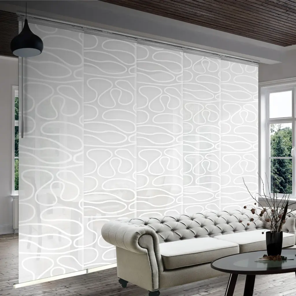 Central Design Products is pleased to introduce a new innovative panel track that offers easy 2-way installation, adding an alluring style and refined touch to your home decor. The single rail design of the track is sleek, compact, and reduces the overall footprint and weight of the installation, eliminating bulky, intrusive window treatments. Adjusting the panel height is a breeze � simply trim the panel, re-attach the liner, and install the panel weight. Detailed instructions are included.The panel track also features a patented slider design, made with aluminum and fitted with bearings that allow for durable and smooth operation. The sliders are stacked closer together than conventional panel tracks, reducing light bleed coming from the gaps between panels. This track has endless uses from dividing rooms, garages, offices, and closets to decorating windows and patios. Available in larger sizes including 8, 10, and 12 panels. Extends from 58-110� wide. Each panel measures 23.5" wide and 116" tall, with a total installation height of 118.5" (includes the 2.5" rail track). The track can be wall or ceiling mounted. The panels can stack on the left or the right. The clearance from the wall is extendable from 1.25� to 3.25� and projection from the wall is extendable from 3� to 4.25�. Whirl White panel is made from 100% Polyester, with a light filtering shade that blocks 50% of the light.