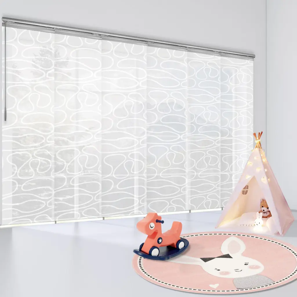 Central Design Products is pleased to introduce a new innovative panel track that offers easy 2-way installation, adding an alluring style and refined touch to your home decor. The single rail design of the track is sleek, compact, and reduces the overall footprint and weight of the installation, eliminating bulky, intrusive window treatments. Adjusting the panel height is a breeze � simply trim the panel, re-attach the liner, and install the panel weight. Detailed instructions are included.The panel track also features a patented slider design, made with aluminum and fitted with bearings that allow for durable and smooth operation. The sliders are stacked closer together than conventional panel tracks, reducing light bleed coming from the gaps between panels. This track has endless uses from dividing rooms, garages, offices, and closets to decorating windows and patios. Available in larger sizes including 8, 10, and 12 panels. Extends from 98-130� wide. Each panel measures 23.5" wide and 91.5" tall, with a total installation height of 94" (includes the 2.5" rail track). The track can be wall or ceiling mounted. The panels can stack on the left or the right. The clearance from the wall is extendable from 1.25� to 3.25� and projection from the wall is extendable from 3� to 4.25�. Whirl White panel is made from 100% Polyester, with a light filtering shade that blocks 50% of the light.