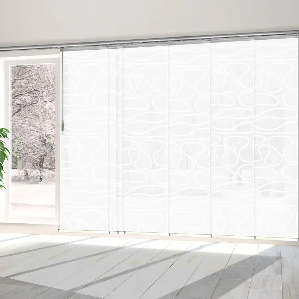 Central Design Products is pleased to introduce a new innovative panel track that offers easy 2-way installation, adding an alluring style and refined touch to your home decor. The single rail design of the track is sleek, compact, and reduces the overall footprint and weight of the installation, eliminating bulky, intrusive window treatments. Adjusting the panel height is a breeze � simply trim the panel, re-attach the liner, and install the panel weight. Detailed instructions are included.The panel track also features a patented slider design, made with aluminum and fitted with bearings that allow for durable and smooth operation. The sliders are stacked closer together than conventional panel tracks, reducing light bleed coming from the gaps between panels. This track has endless uses from dividing rooms, garages, offices, and closets to decorating windows and patios. Available in larger sizes including 8, 10, and 12 panels. Extends from 110-153� wide. Each panel measures 23.5" wide and 91.5" tall, with a total installation height of 94" (includes the 2.5" rail track). The track can be wall or ceiling mounted. The panels can stack on the left or the right. The clearance from the wall is extendable from 1.25� to 3.25� and projection from the wall is extendable from 3� to 4.25�. Whirl White panel is made from 100% Polyester, with a light filtering shade that blocks 50% of the light.