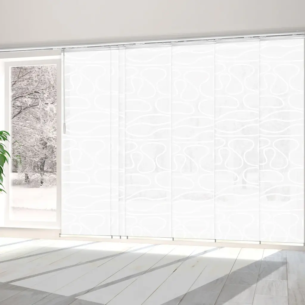 Central Design Products is pleased to introduce a new innovative panel track that offers easy 2-way installation, adding an alluring style and refined touch to your home decor. The single rail design of the track is sleek, compact, and reduces the overall footprint and weight of the installation, eliminating bulky, intrusive window treatments. Adjusting the panel height is a breeze � simply trim the panel, re-attach the liner, and install the panel weight. Detailed instructions are included.The panel track also features a patented slider design, made with aluminum and fitted with bearings that allow for durable and smooth operation. The sliders are stacked closer together than conventional panel tracks, reducing light bleed coming from the gaps between panels. This track has endless uses from dividing rooms, garages, offices, and closets to decorating windows and patios. Available in larger sizes including 8, 10, and 12 panels. Extends from 110-153� wide. Each panel measures 23.5" wide and 91.5" tall, with a total installation height of 94" (includes the 2.5" rail track). The track can be wall or ceiling mounted. The panels can stack on the left or the right. The clearance from the wall is extendable from 1.25� to 3.25� and projection from the wall is extendable from 3� to 4.25�. Whirl White panel is made from 100% Polyester, with a light filtering shade that blocks 50% of the light.