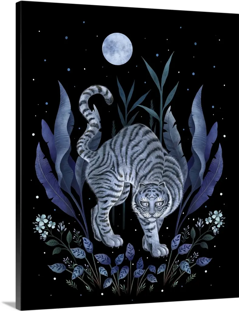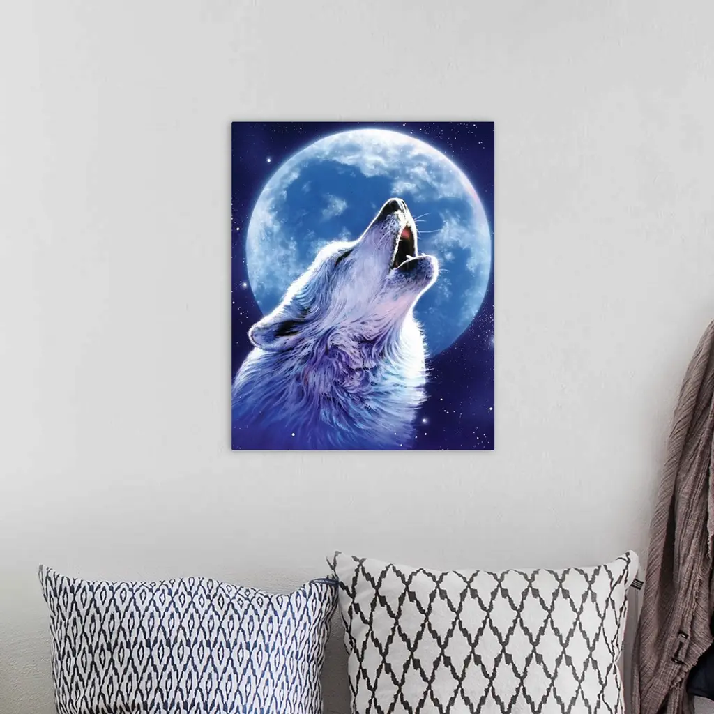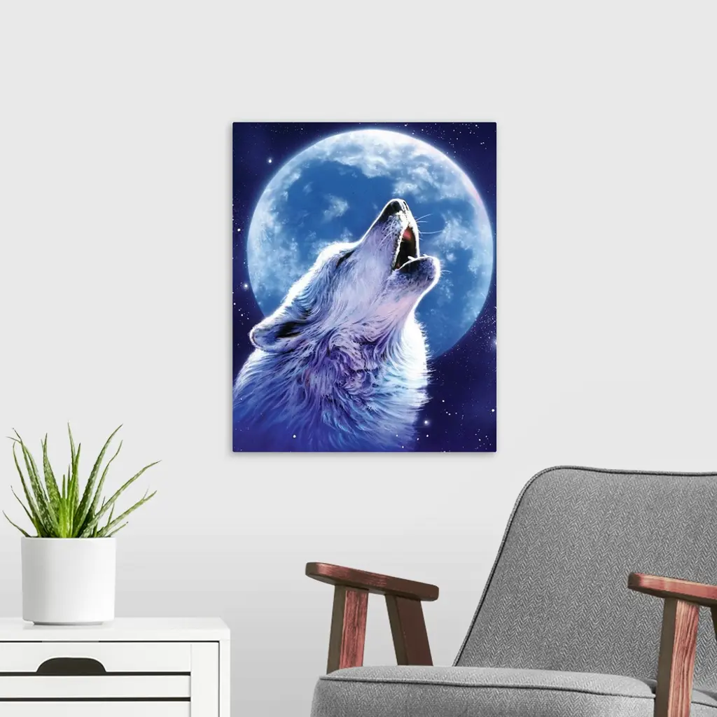 Fantasy art drawing of a wolf howling at the large moon in a star filled sky.