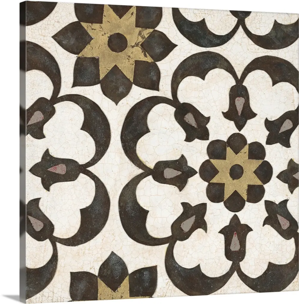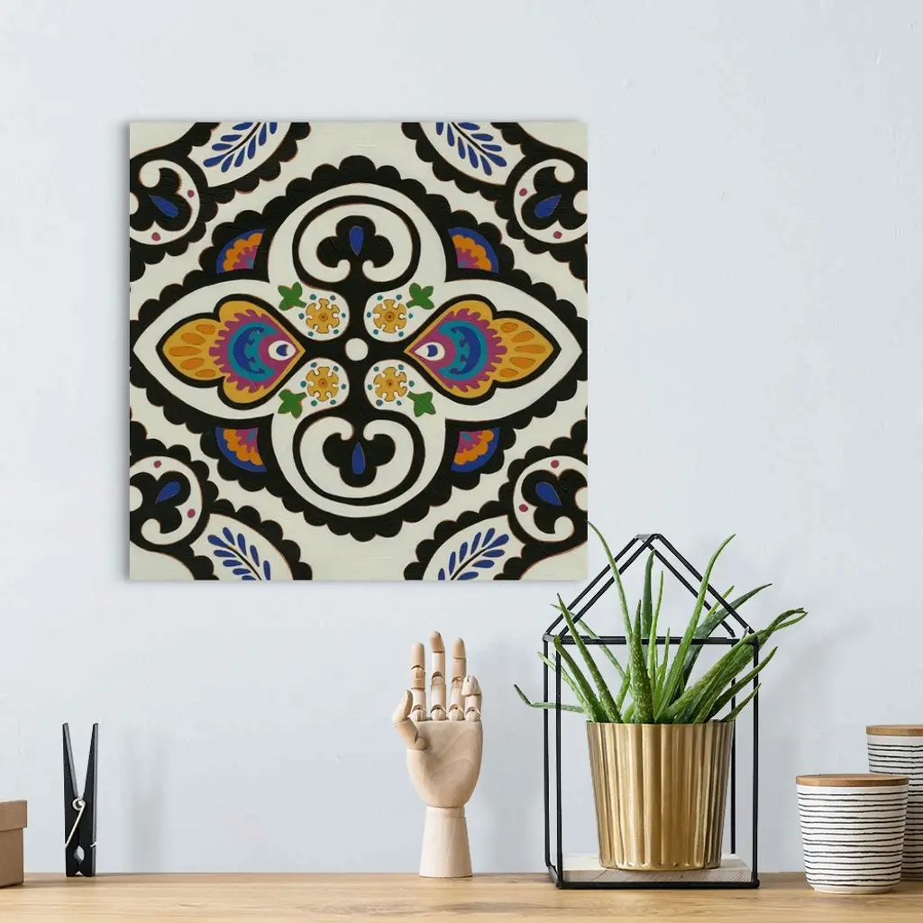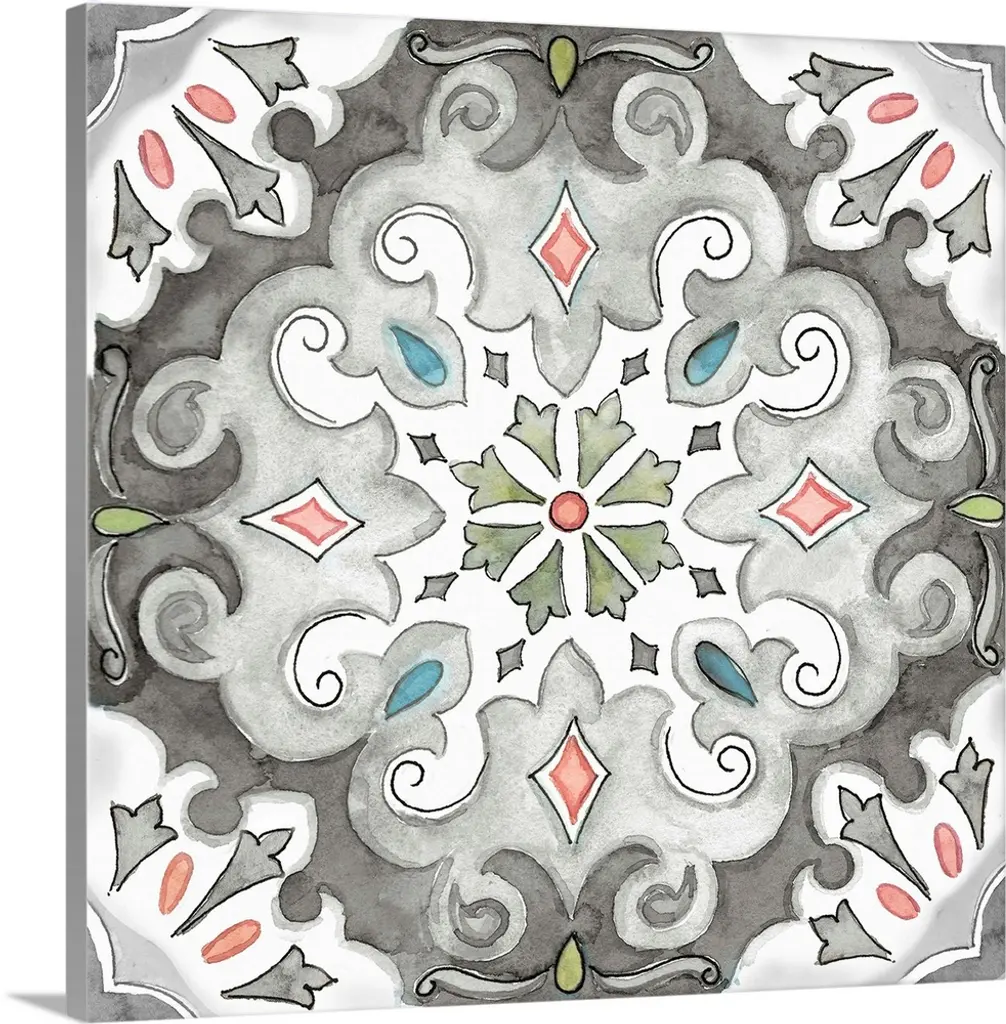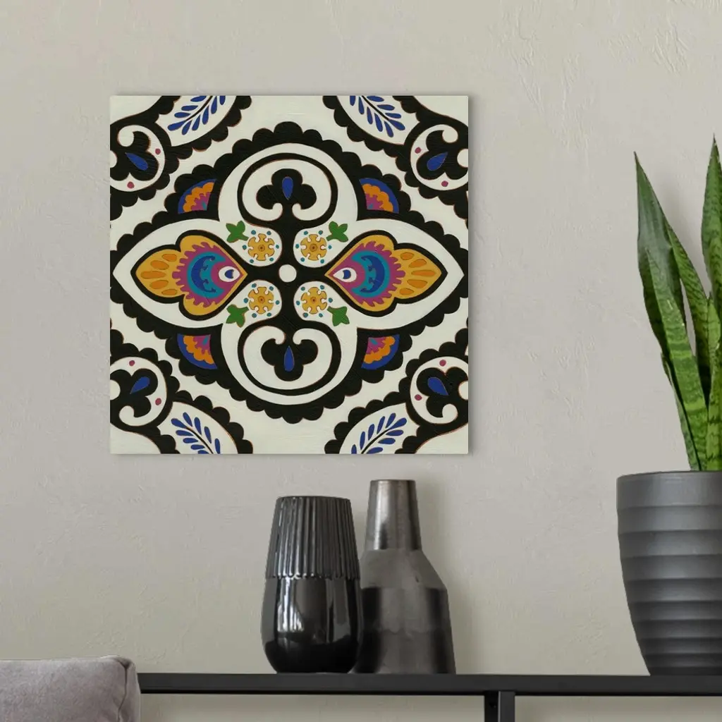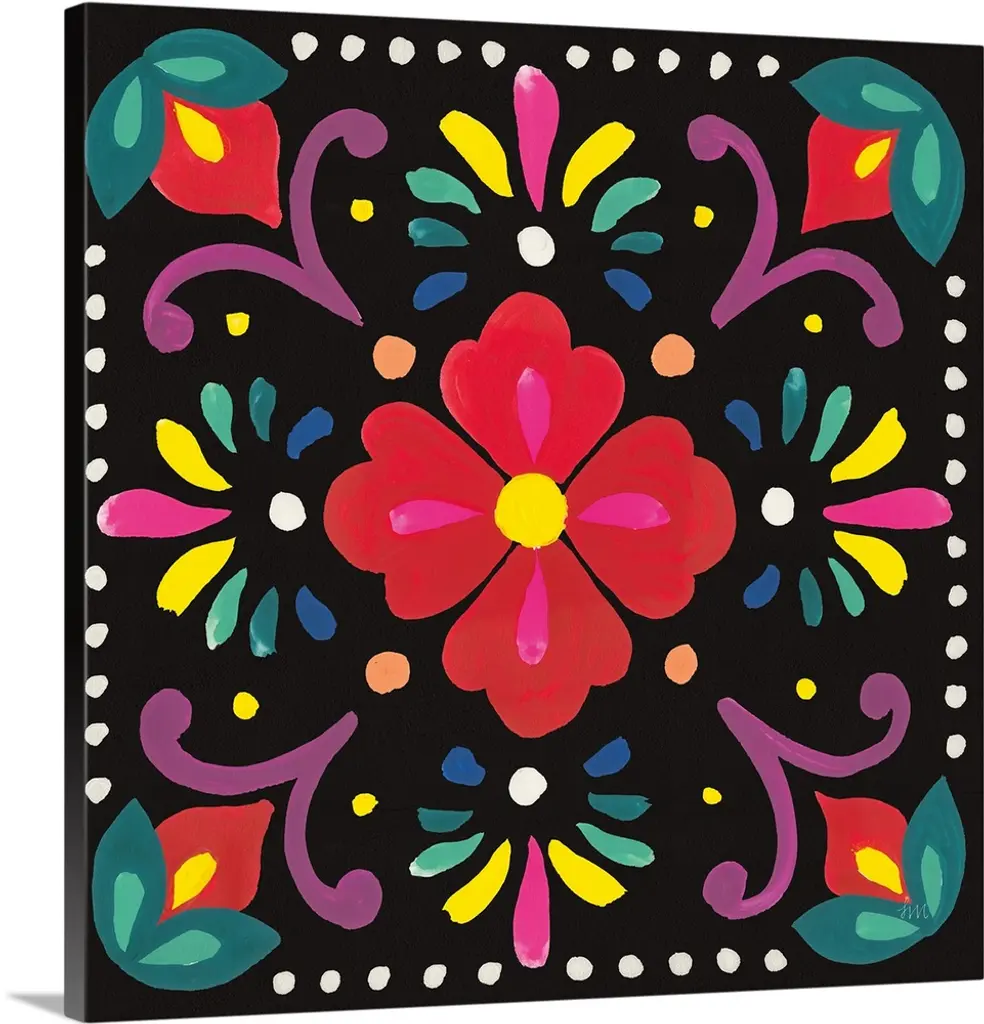 Ornate floral pattern using dark and vibrant colors against a neutral background.
