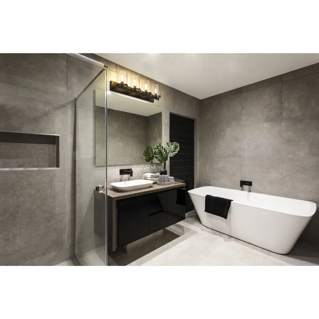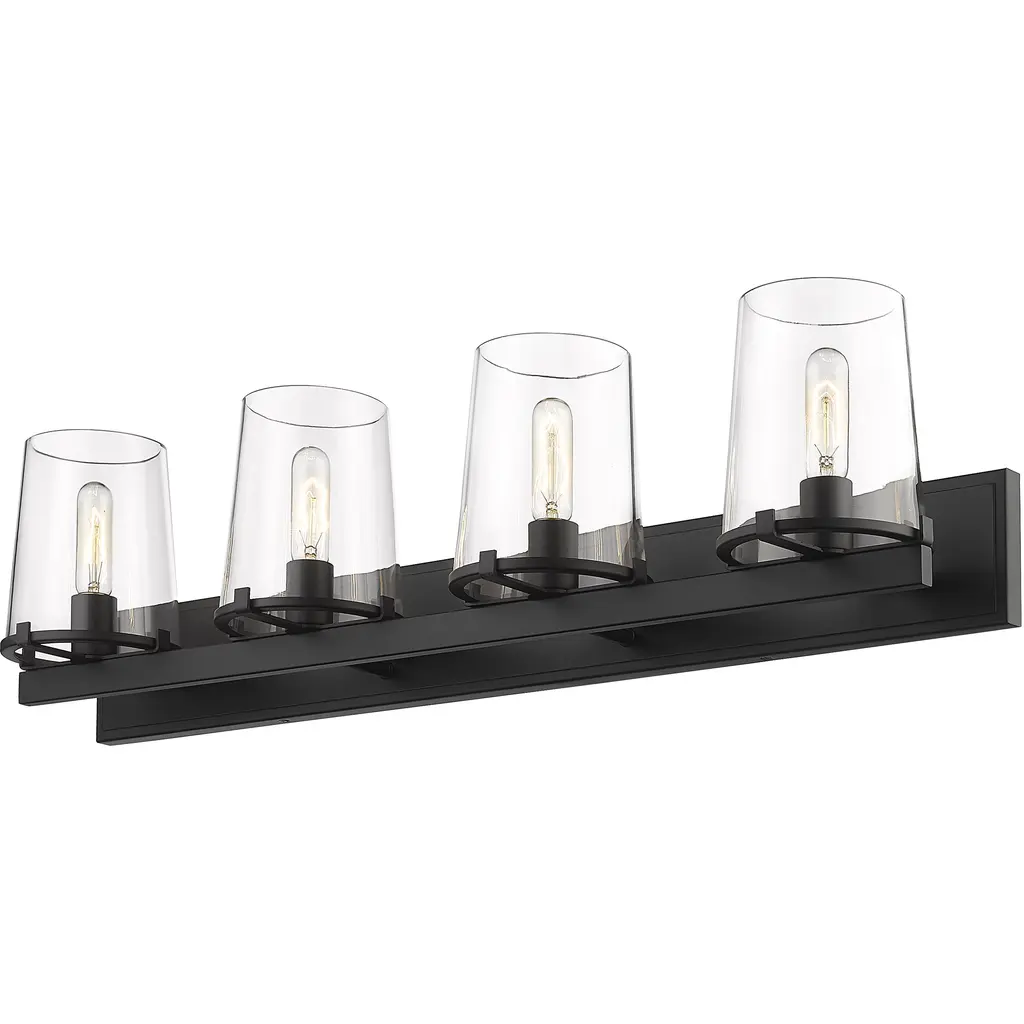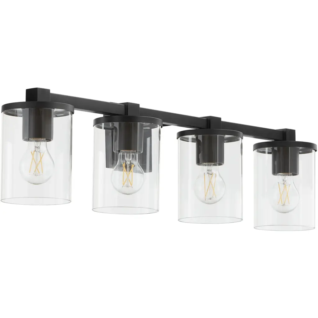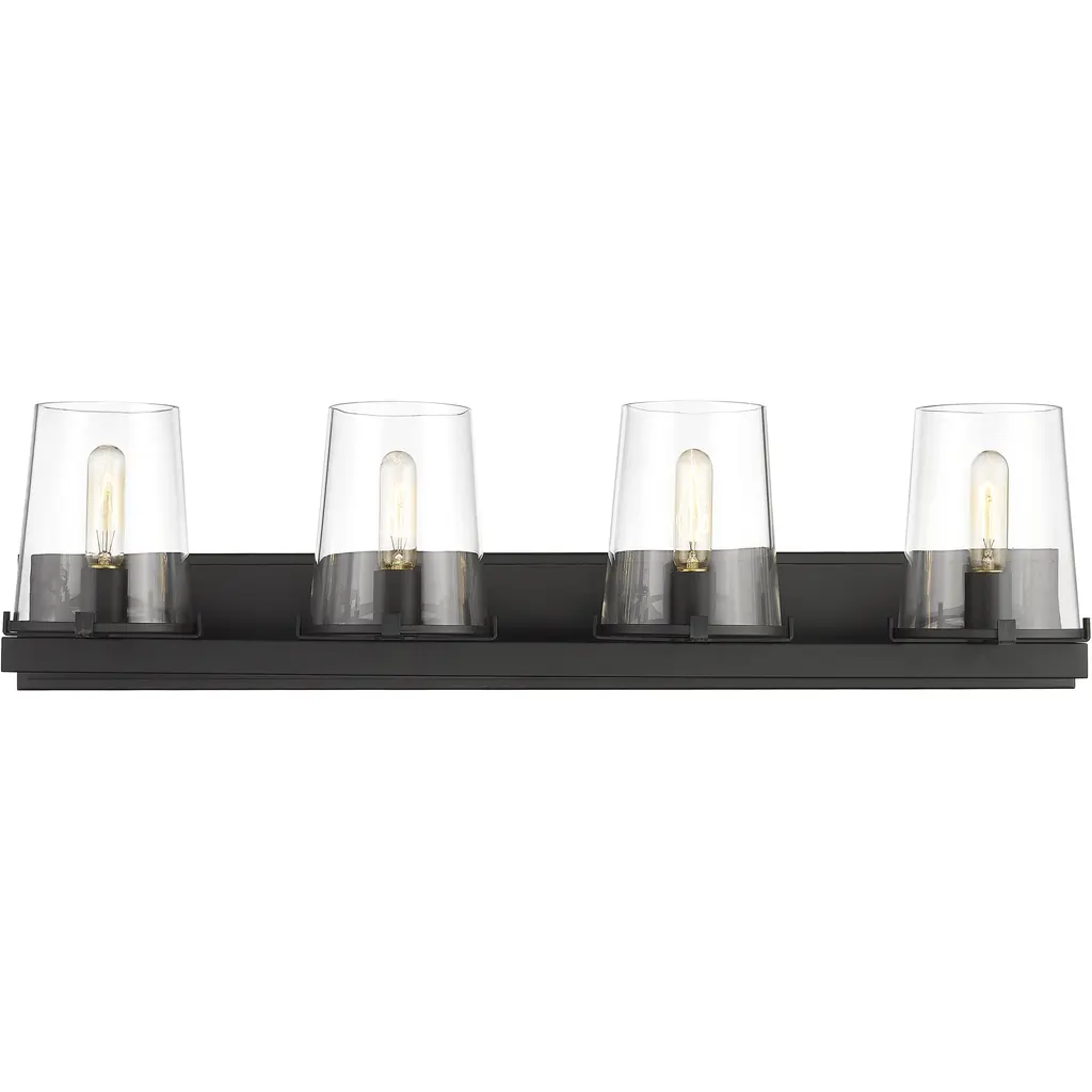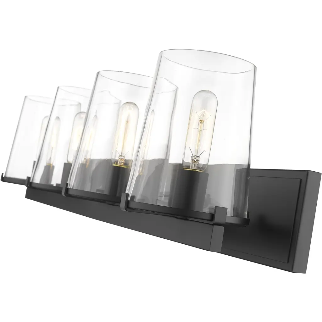 Fashioned of hand-crafted steel and delicate glass, the Callista four-light vanity light frames a bath vanity space with precision and sophistication. Introduce a motif blended of village fare and nautical inspiration to add a tasteful lift for transitional and modern design schemes. Clean styling features a rectangular matte black finish steel frame and wall mount and four tapered clear glass shades, delivering a contrasting yet versatile look that works in a number of settings.