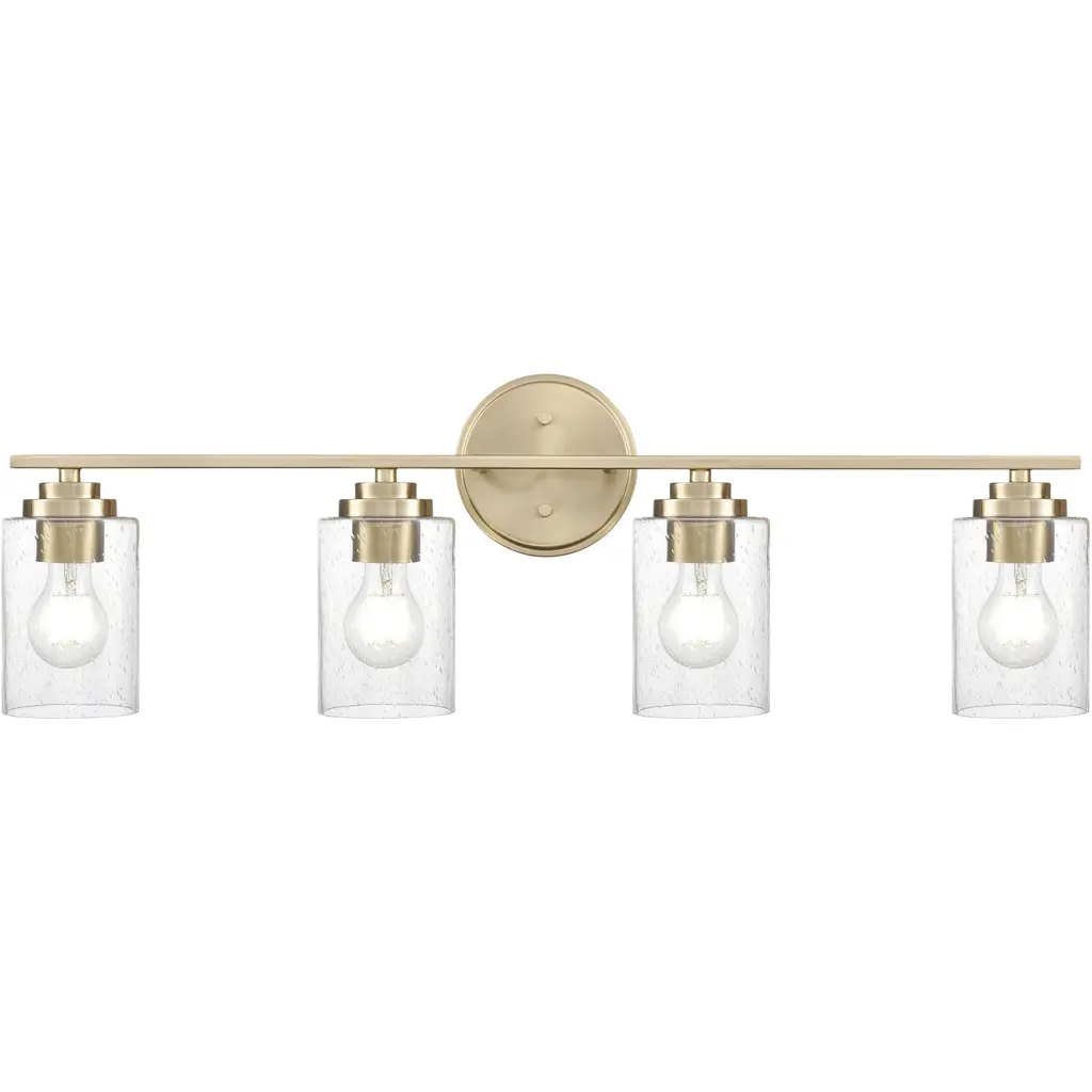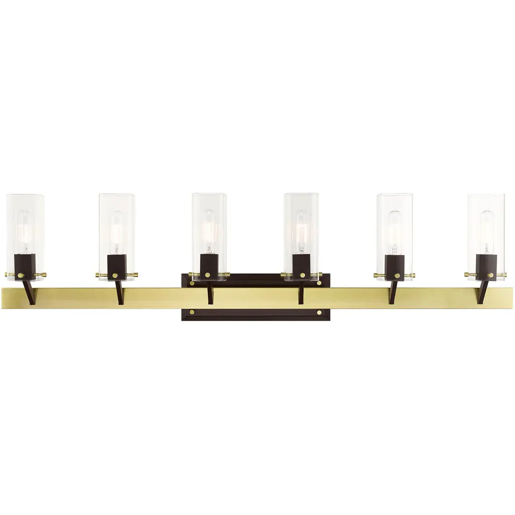 From powder rooms to master baths, this rubbed brass vanity light is an elegant complement to transitional bathroom decor. Featuring five glowing lights beneath clear glass shades, this fixture creates a stylish setting to get ready for the day.