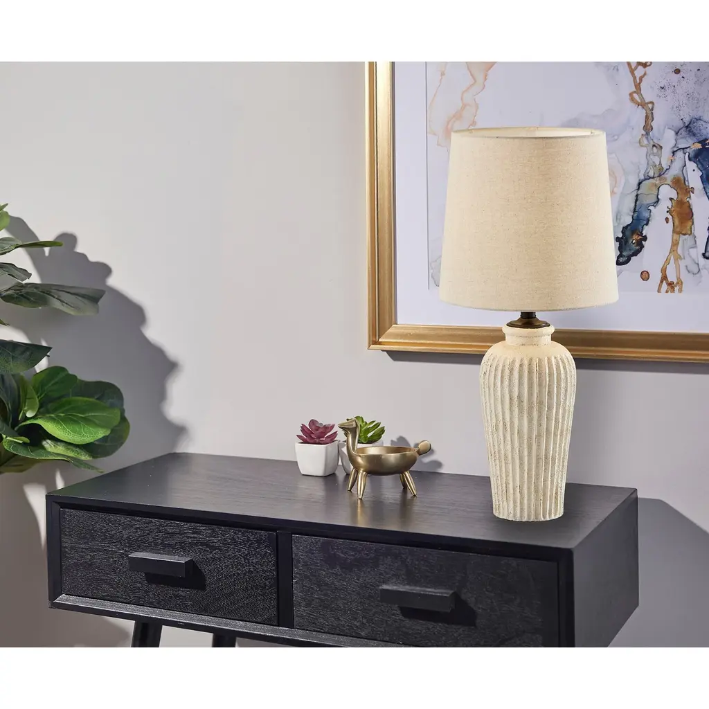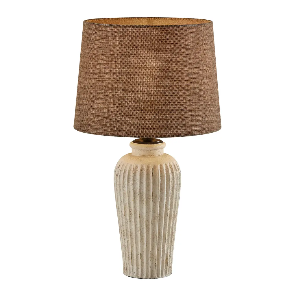 Introducing the SL3980-02 Callista Table Lamp, a captivating blend of artisan craftsmanship and contemporary design. The lamp features an off-white ribbed ceramic base, meticulously handcrafted to showcase intricate details and texture. Paired with a tan textured fabric shade, this lamp exudes warmth and elegance. Standing at 26 inches tall, it serves as a striking focal point in any room. The on/off rotary switch on the socket ensures effortless control, making it a versatile and stylish lighting solution for your home. -Artisan craftsmanship: Off-white ribbed ceramic base adds a touch of artisanal charm to your space. -Textured elegance: Tan textured fabric shade enhances the lamp's visual appeal and diffuses soft, inviting light. -Versatile height: Stands at 26 inches, making it suitable for side tables, nightstands, or desks. -Easy operation: On/off rotary switch on the socket allows convenient control of the lamp. -Timeless design: Perfect for adding warmth and sophistication to living rooms, bedrooms, or home offices.