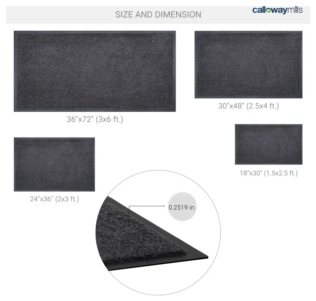 A continuous filament, luxurious cut pile olefin fiber, permanently fused to heavy-duty vinyl backing, makes this an excellent choice for heavy traffic areas. Eighteen ounces per square yard of tough, heavy denier fibers allows this mat to trap more water and dry faster than other carpet fibers while stopping dirt at the door. Perfect for entranceways into malls, churches, schools, industrial plants, hotels, hospitals, restaurants, offices etc. Cleans easily by vacuuming or sweeping with a damp broom.