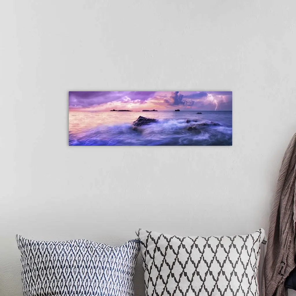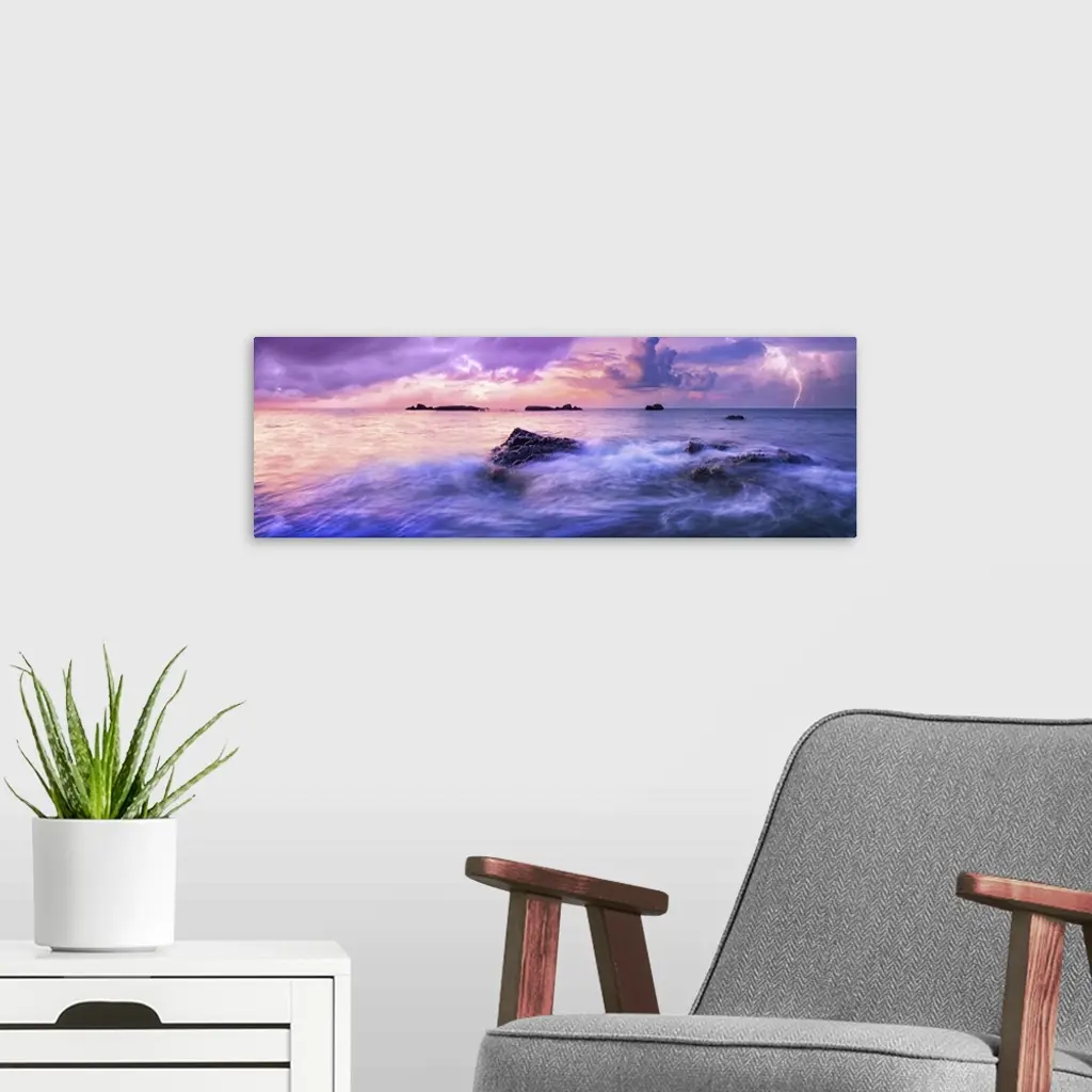 Colorful calm sea during sunset. A storm is approaching over the horizon. Colorful dark clouds in the air, electric discharges herald the coming storm.