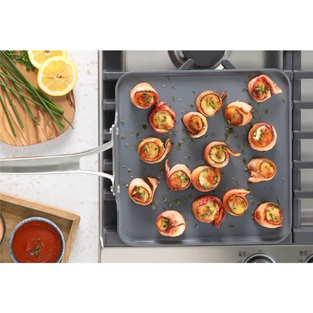 This ceramic non-stick griddle from Calphalon cooks precisely and cleans up quickly. Finished in a scratch-resistant ceramic coating that prevents food from sticking as it cooks, the hard-anodized aluminum pan eliminates hotspots for even browning, sauteing and searing. The stay-cool stainless steel handle offers a comfortable grip as you cook. Finished in deep blue, this square griddle looks classic on your stovetop or pot rack.Calphalon has been making high-quality cookware since 1968, when the company developed a new technology derived from the aerospace industry to create durable hard-anodized aluminum cookware.