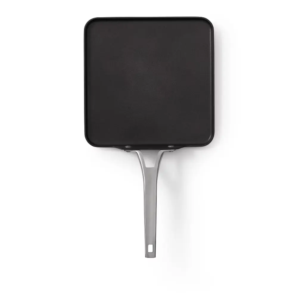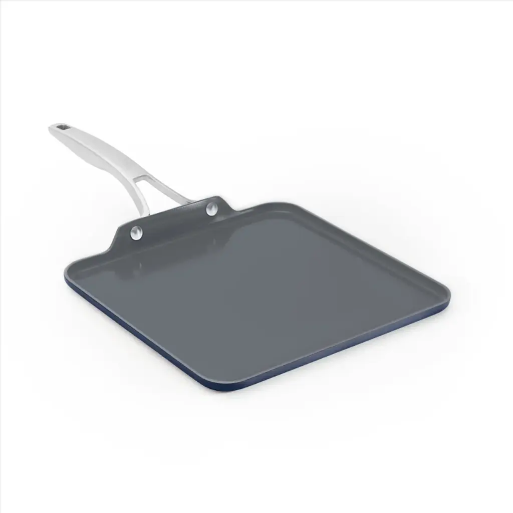 This ceramic non-stick griddle from Calphalon cooks precisely and cleans up quickly. Finished in a scratch-resistant ceramic coating that prevents food from sticking as it cooks, the hard-anodized aluminum pan eliminates hotspots for even browning, sauteing and searing. The stay-cool stainless steel handle offers a comfortable grip as you cook. Finished in creamy taupe, this square griddle looks elegant on your stovetop or pot rack.Calphalon has been making high-quality cookware since 1968, when the company developed a new technology derived from the aerospace industry to create durable hard-anodized aluminum cookware.