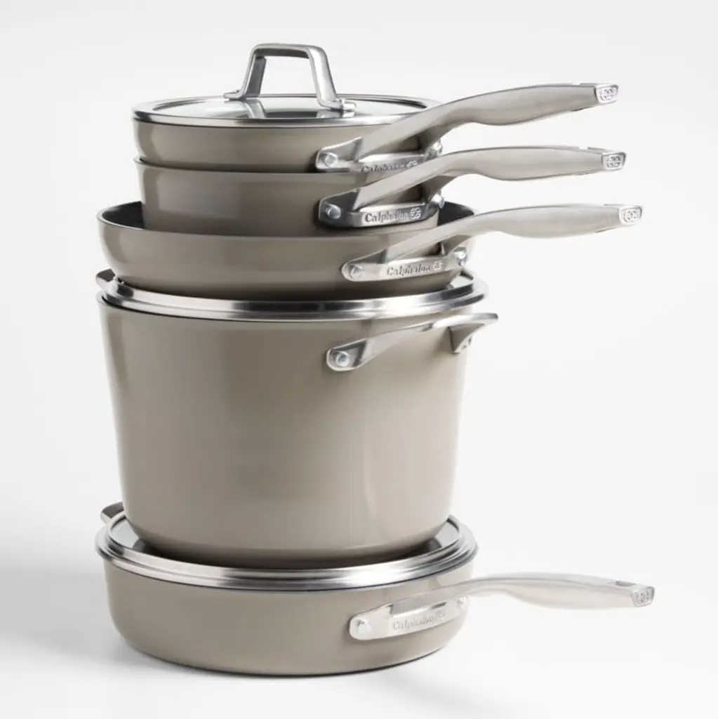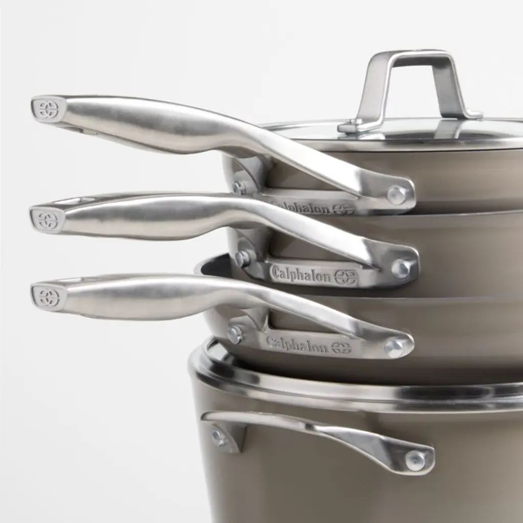 This ceramic non-stick cookware set from Calphalon cooks precisely and cleans up quickly. Finished in a scratch-resistant ceramic coating that prevents food from sticking as it cooks, the hard-anodized aluminum pans eliminate hotspots for even browning, sauteing, searing and simmering. Stay-cool stainless steel handles offer a comfortable grip as you cook.Calphalon has been making high-quality cookware since 1968, when the company developed a new technology derived from the aerospace industry to create durable hard-anodized aluminum cookware.