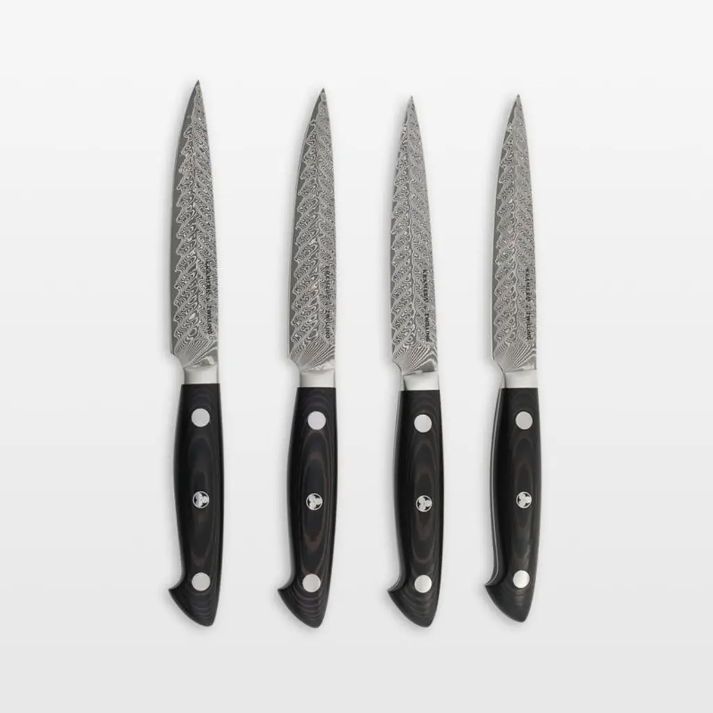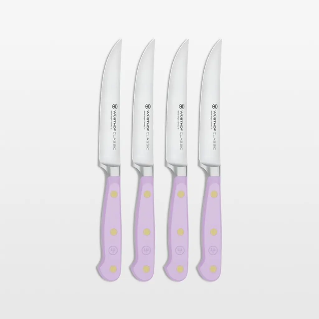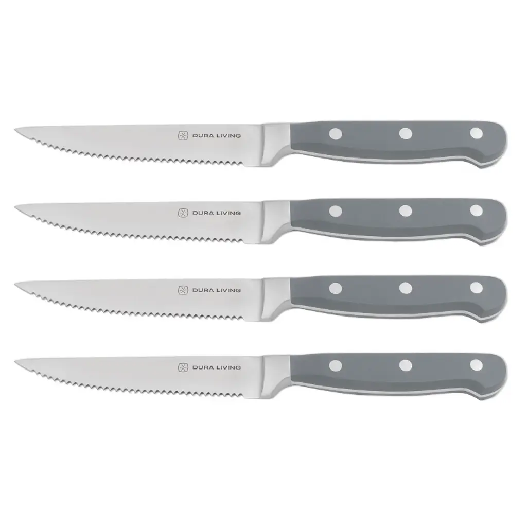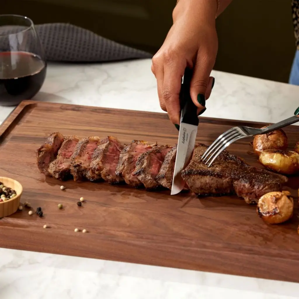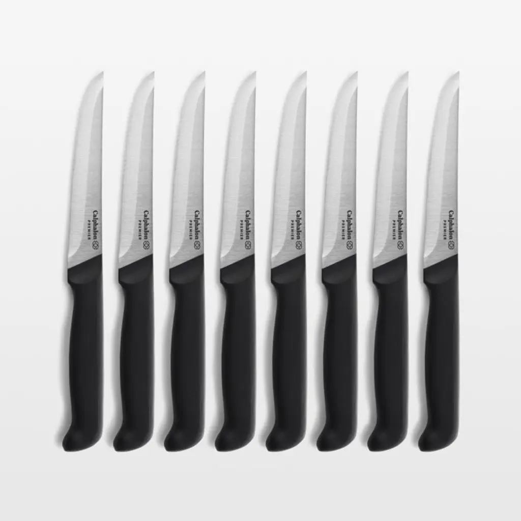 This set of eight steak knives offers precision, durability and cutting strength. Designed to glide effortlessly through thick cuts of meat, the high-carbon steel blades feature semi-serrated edges. The full-tang construction and black ergonomic handles provide balance and comfort as you and your guests dine.View all Calphalon cutlery and tools