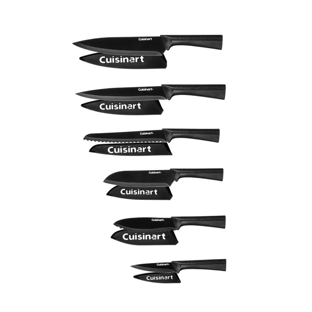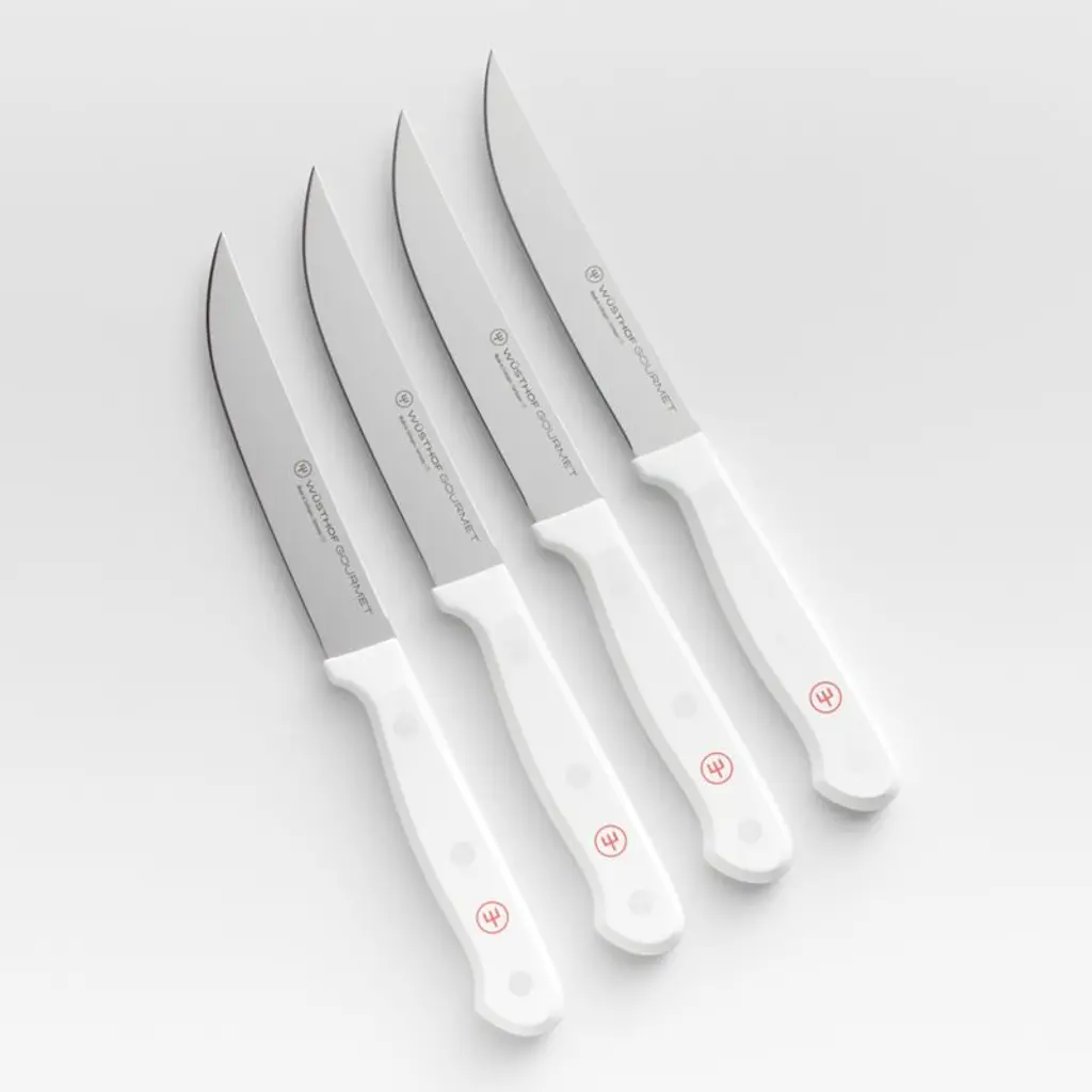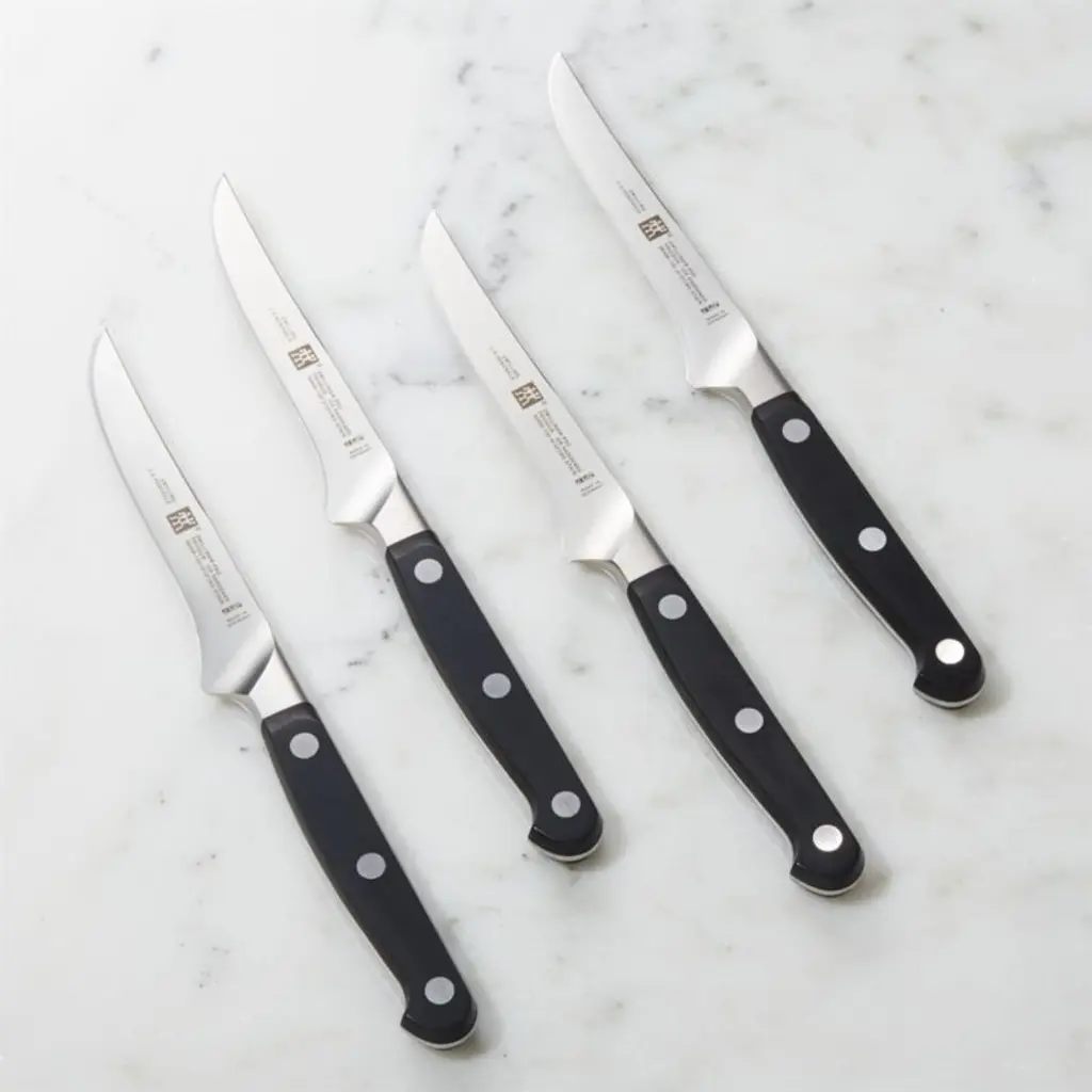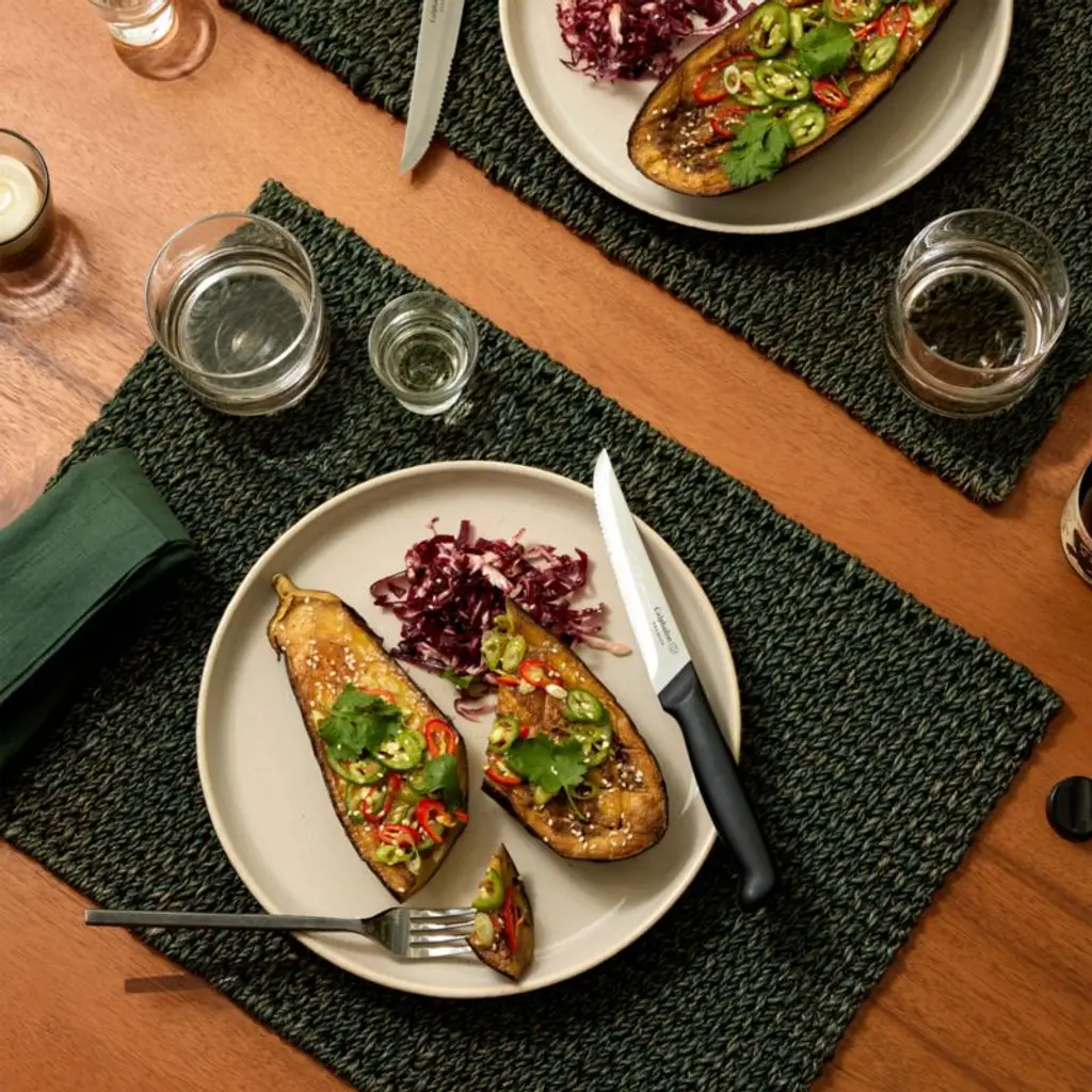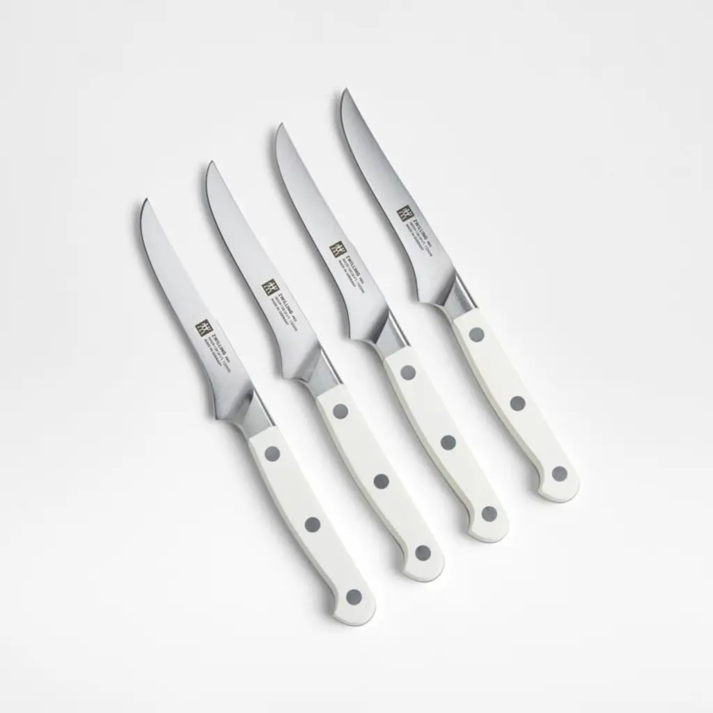 This set of eight steak knives offers precision, durability and cutting strength. Designed to glide effortlessly through thick cuts of meat, the high-carbon steel blades feature semi-serrated edges. The full-tang construction and black ergonomic handles provide balance and comfort as you and your guests dine.View all Calphalon cutlery and tools