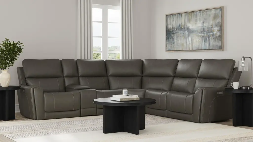 Power up and enjoy unexpected perks with the Calvin triple-power right arm-facing recliner. One of six components of the Calvin sectional collection available to suit your space, this piece offers customizable recline, headrest, and lumbar support, as well as a zero-gravity position for the ultimate comfort experience. The Calvin will make a statement in your home with luxe faux leather that's durable and easy to clean in two rich color choices. Flared arms, contoured seats and heavy thread stitching details give it a sleek, yet striking look.