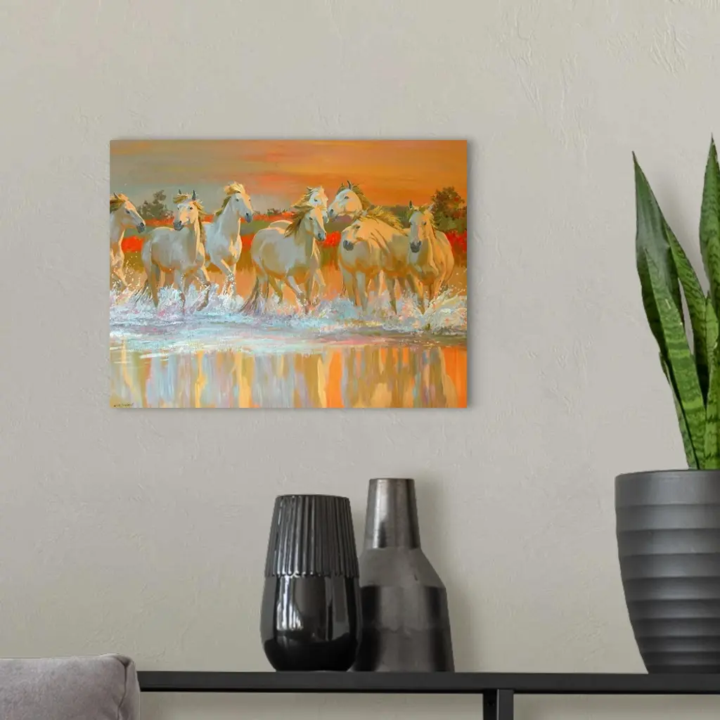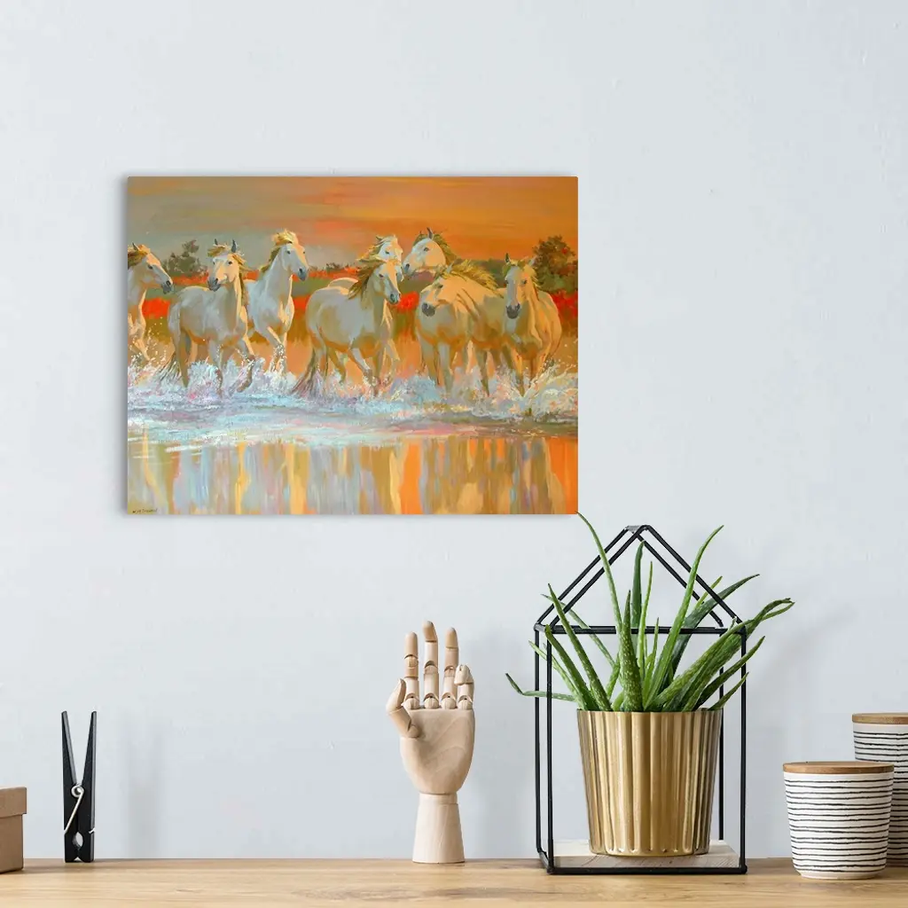 Landscape canvas wall art of wild, white horses galloping through water at sunset.