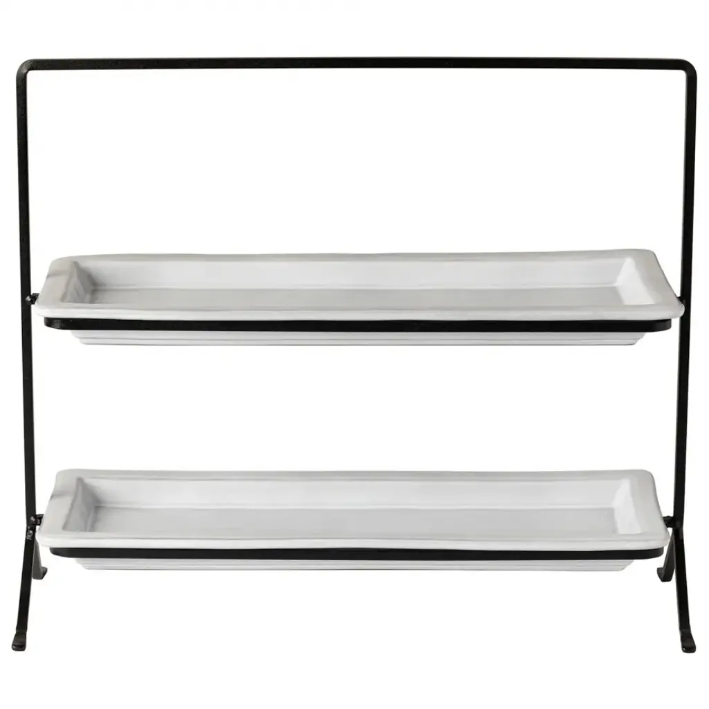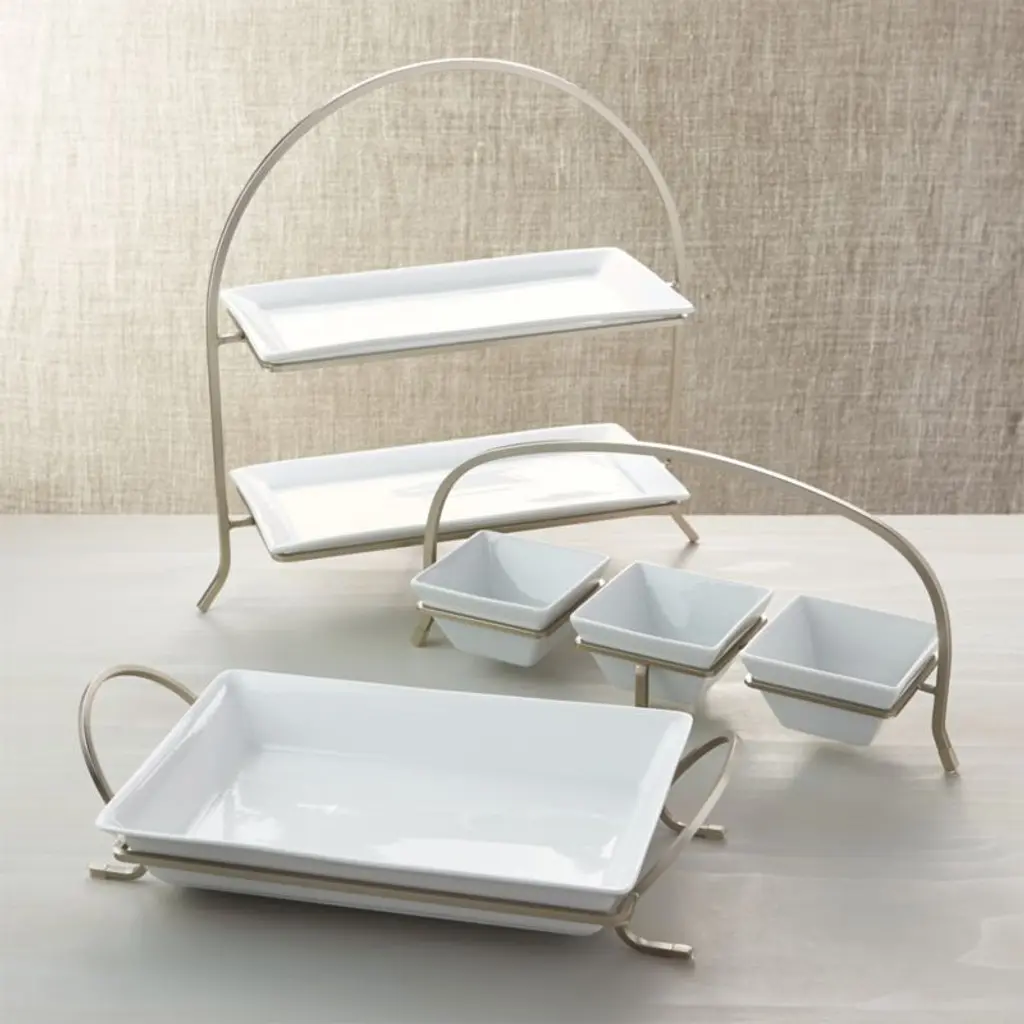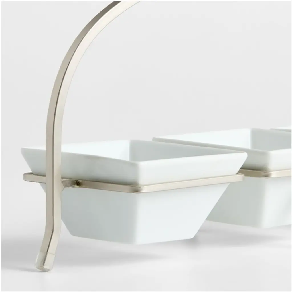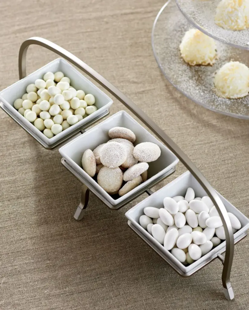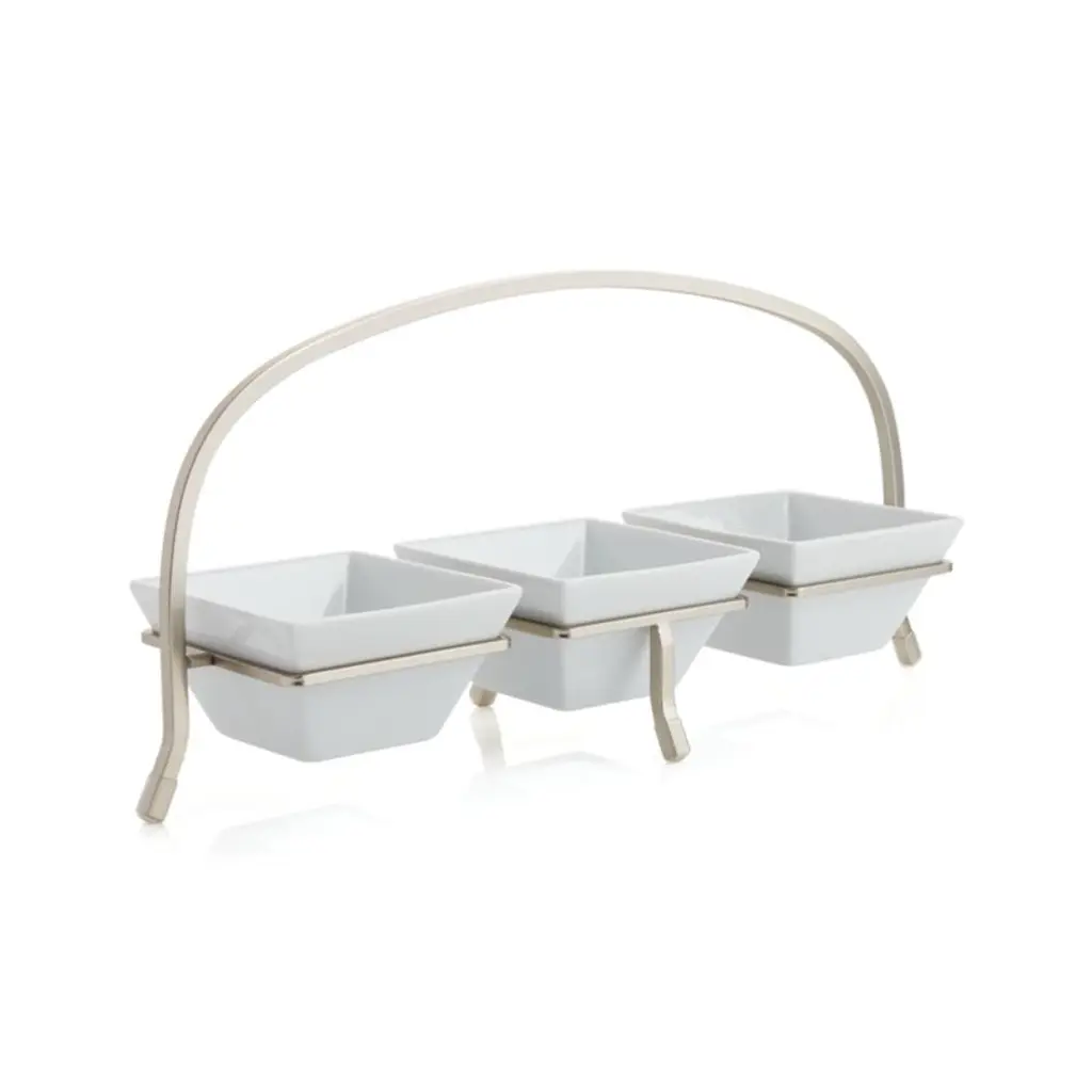 A simple, stylish design to serve condiments, snacks, desserts, appetizers and toppings, this gift-registry favorite presents a trio of rectangular bowls on a silver-finished iron base.