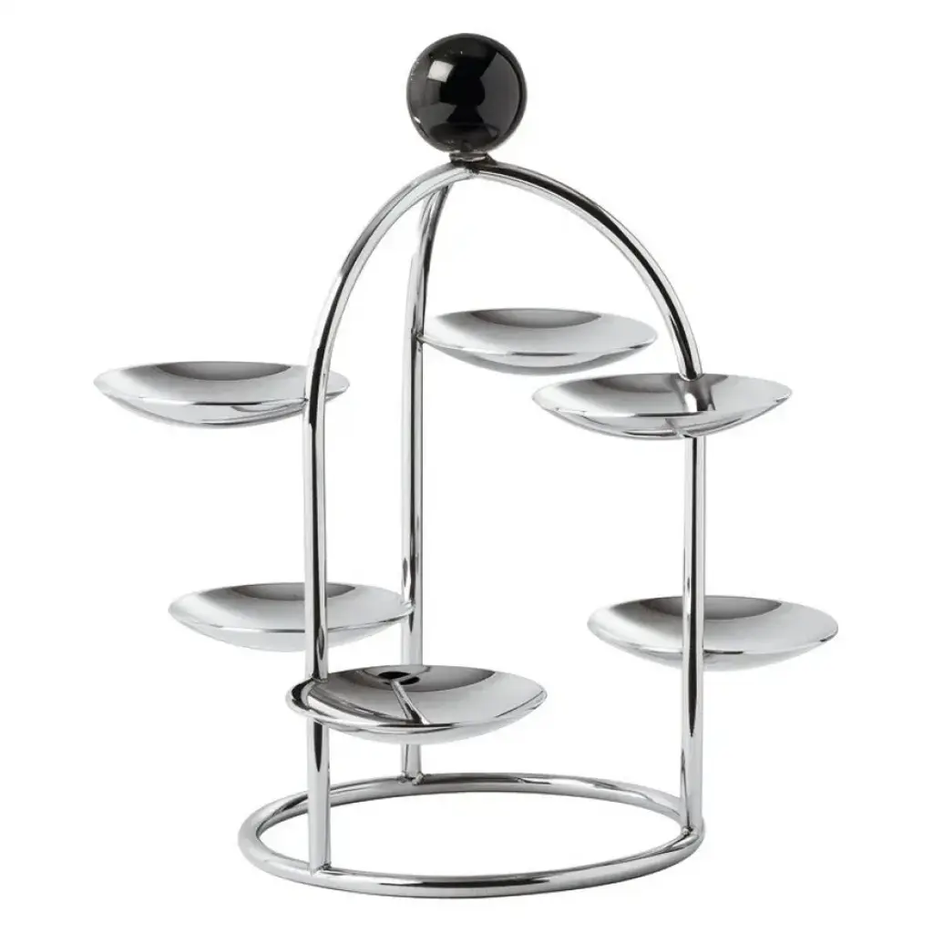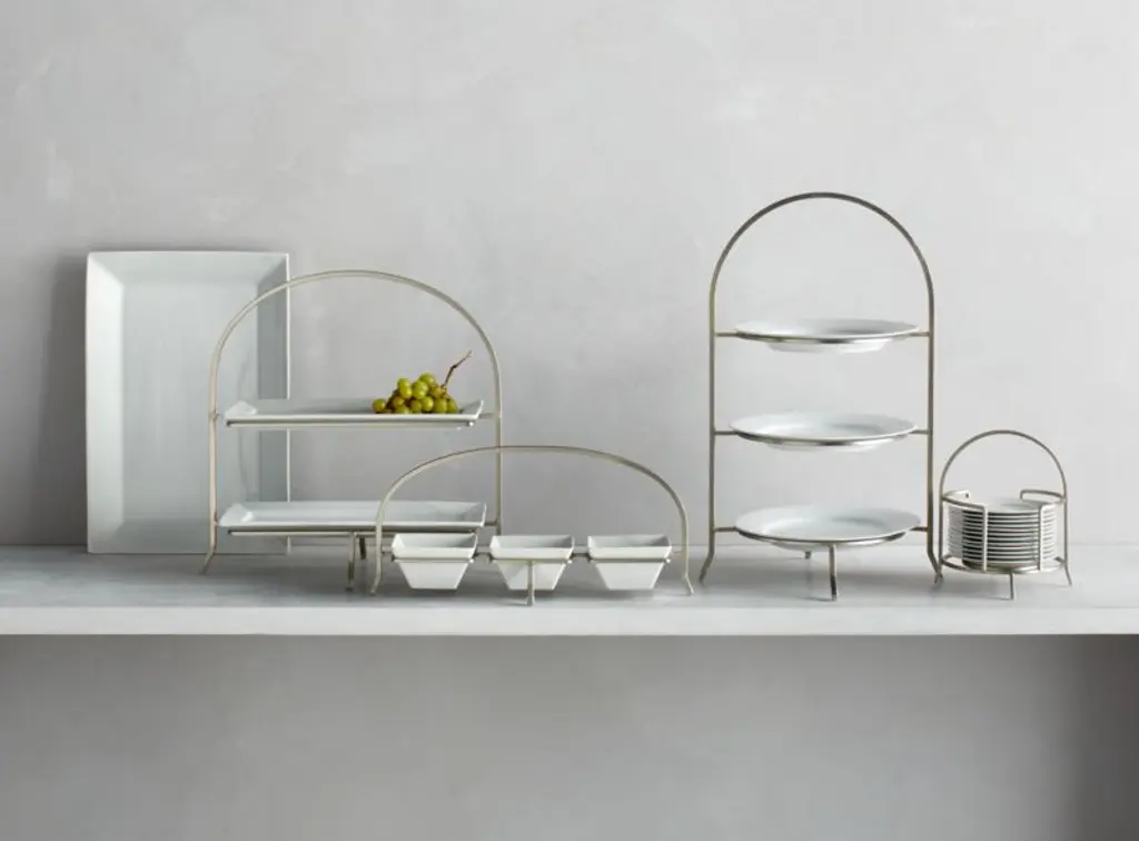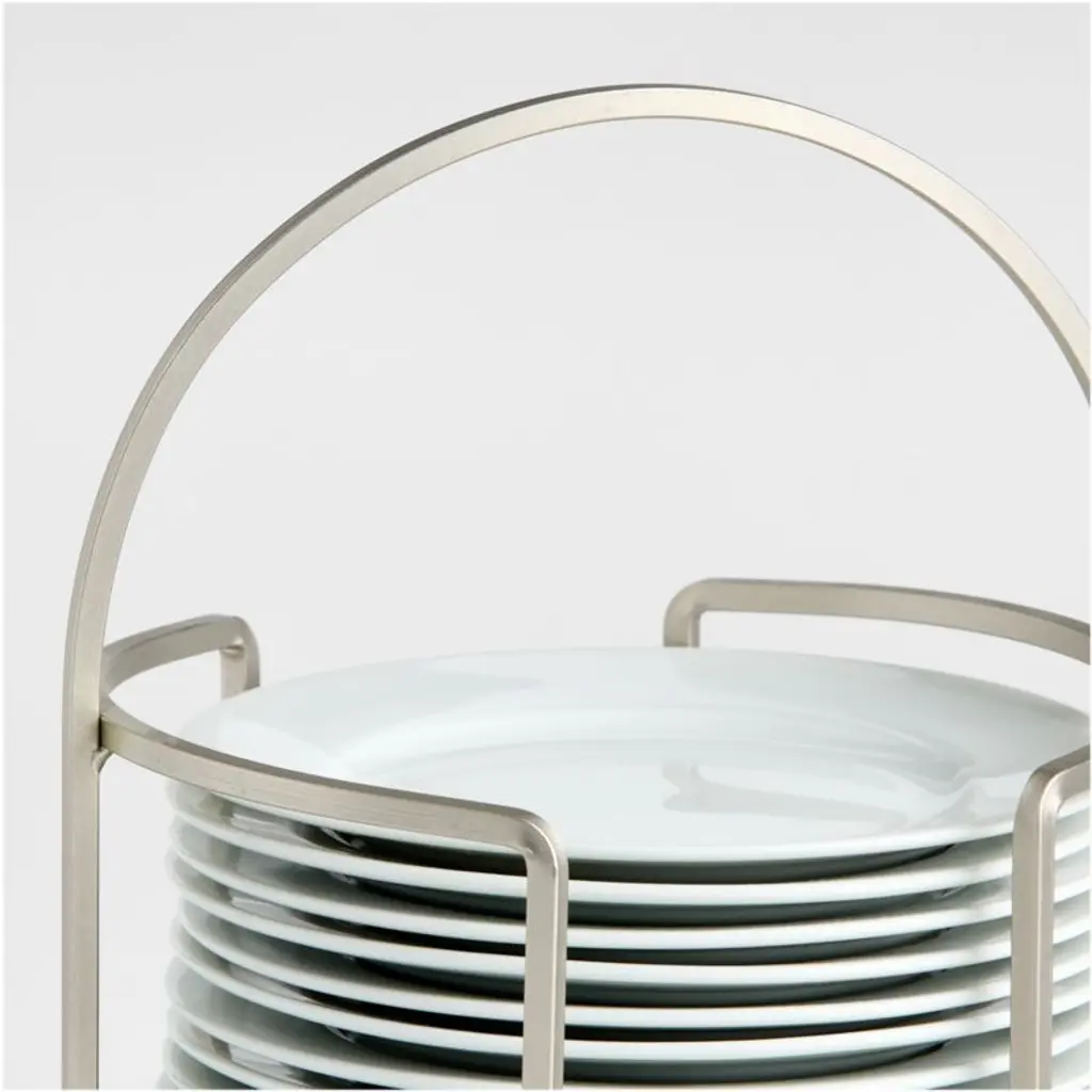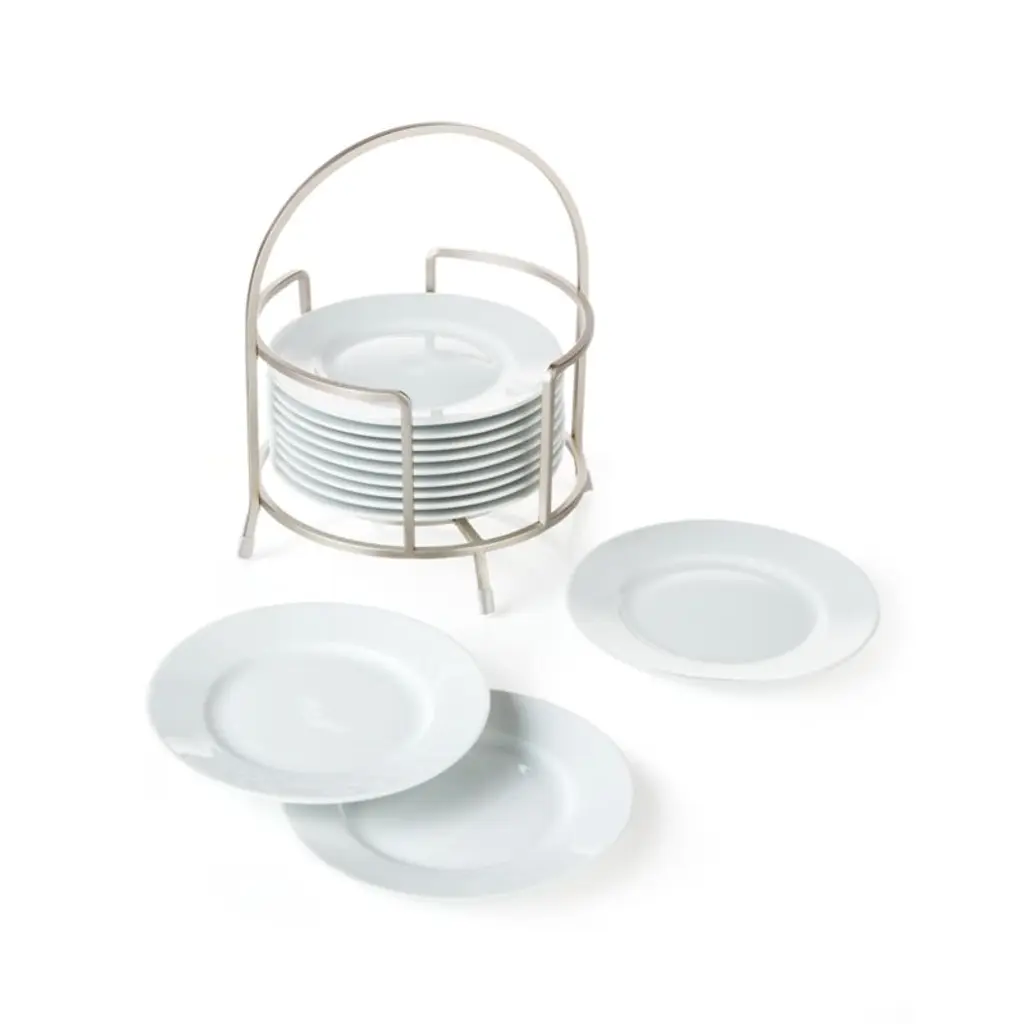 Handy for buffets or informal dessert service, our Cambridge stand stacks 12 white porcelain appetizer plates in a simple metal stand. Perfect for holiday parties, birthday gatherings or cocktail hour, the set is portable and space-saving.