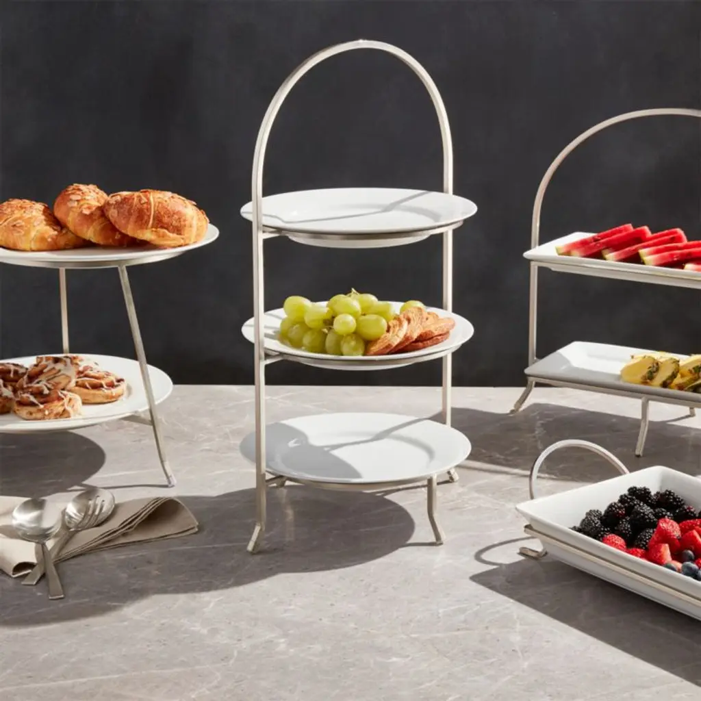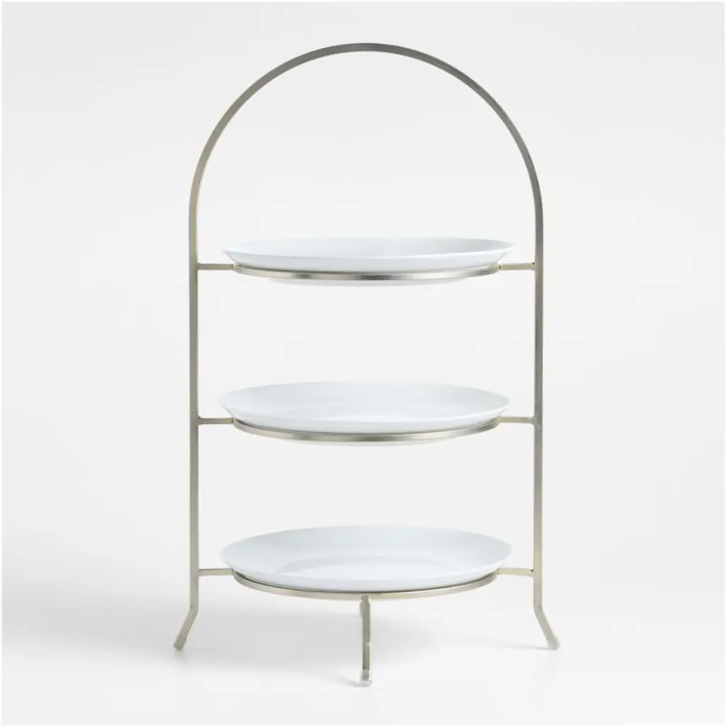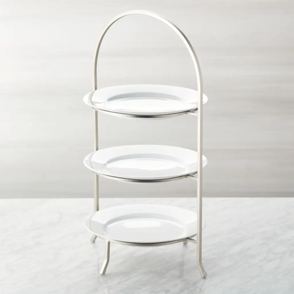 Made of sturdy iron with a nickel-plated finish, this three-tier stand provides a space-saving solution to stacking dinner plates or displaying buffet items. Plates not included. The gleaming silvery stand, a Crate and Barrel exclusive, elevates appetizers, fresh fruit and diminutive desserts. For a coordinated table or buffet, pair the stand with the other pieces in our Cambridge serving collection.
