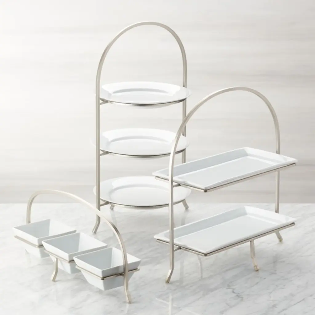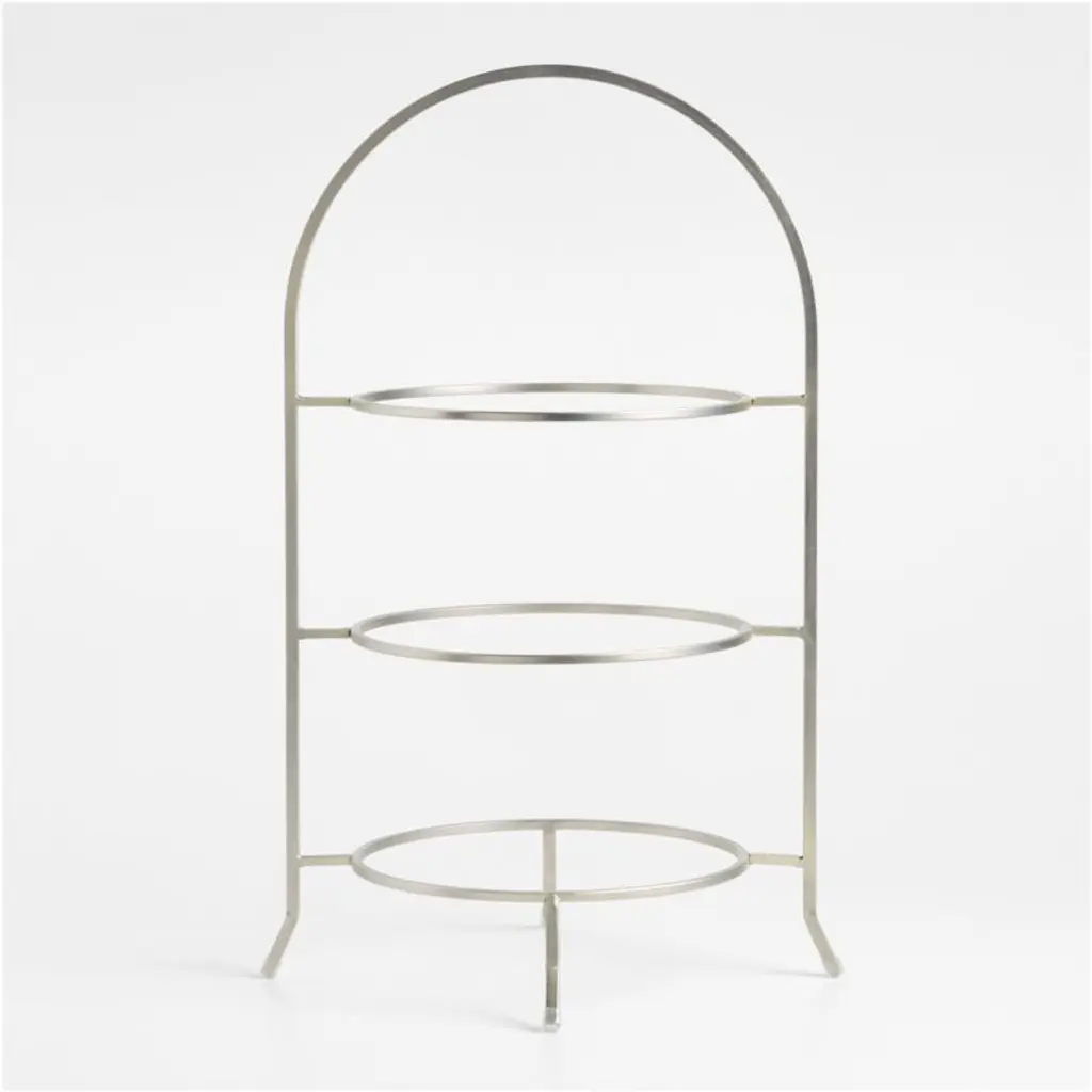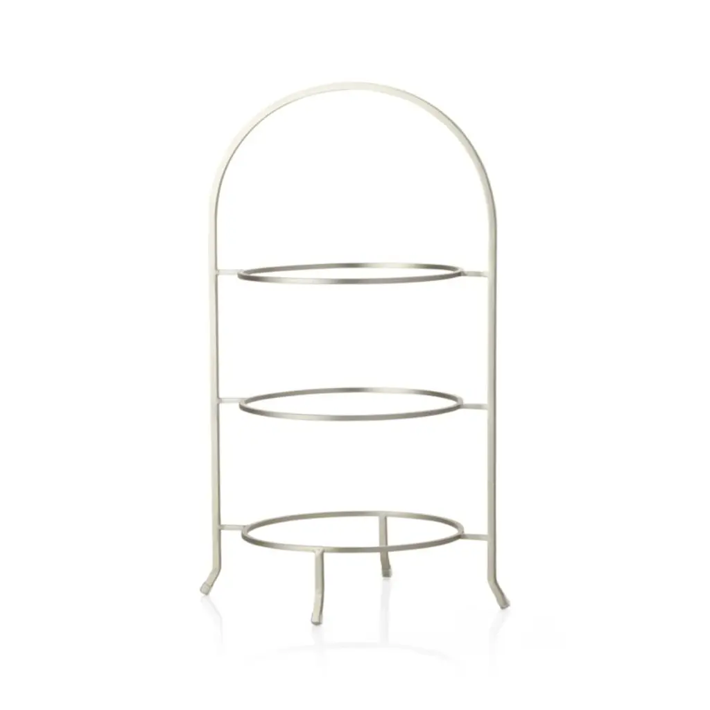 Made of sturdy iron with a nickel-plated finish, this three-tier stand provides a space-saving solution to stacking dinner plates or displaying buffet items. Plates not included. The gleaming silvery stand, a Crate and Barrel exclusive, elevates appetizers, fresh fruit and diminutive desserts. For a coordinated table or buffet, pair the stand with the other pieces in our Cambridge serving collection.