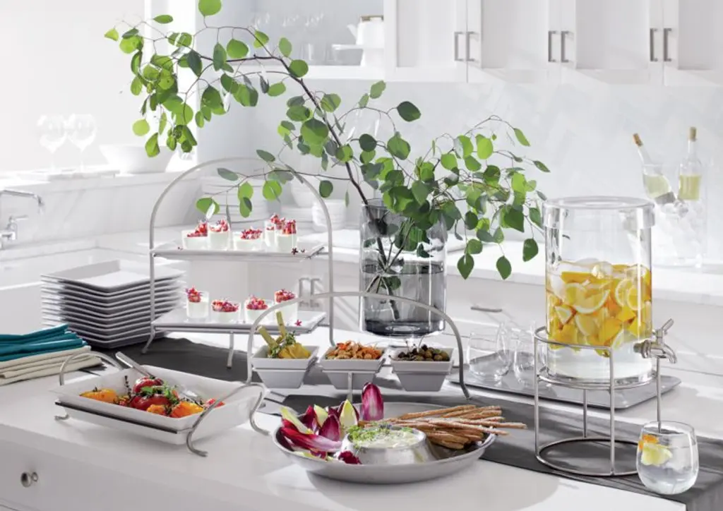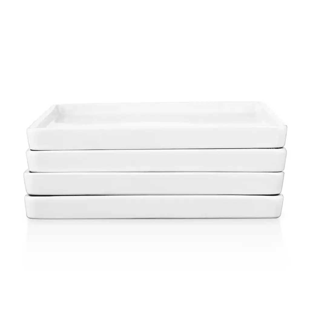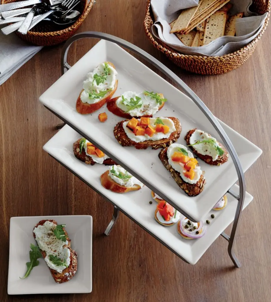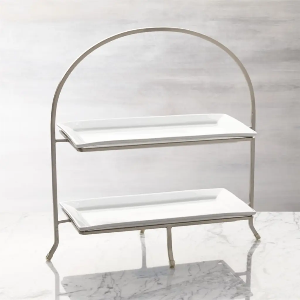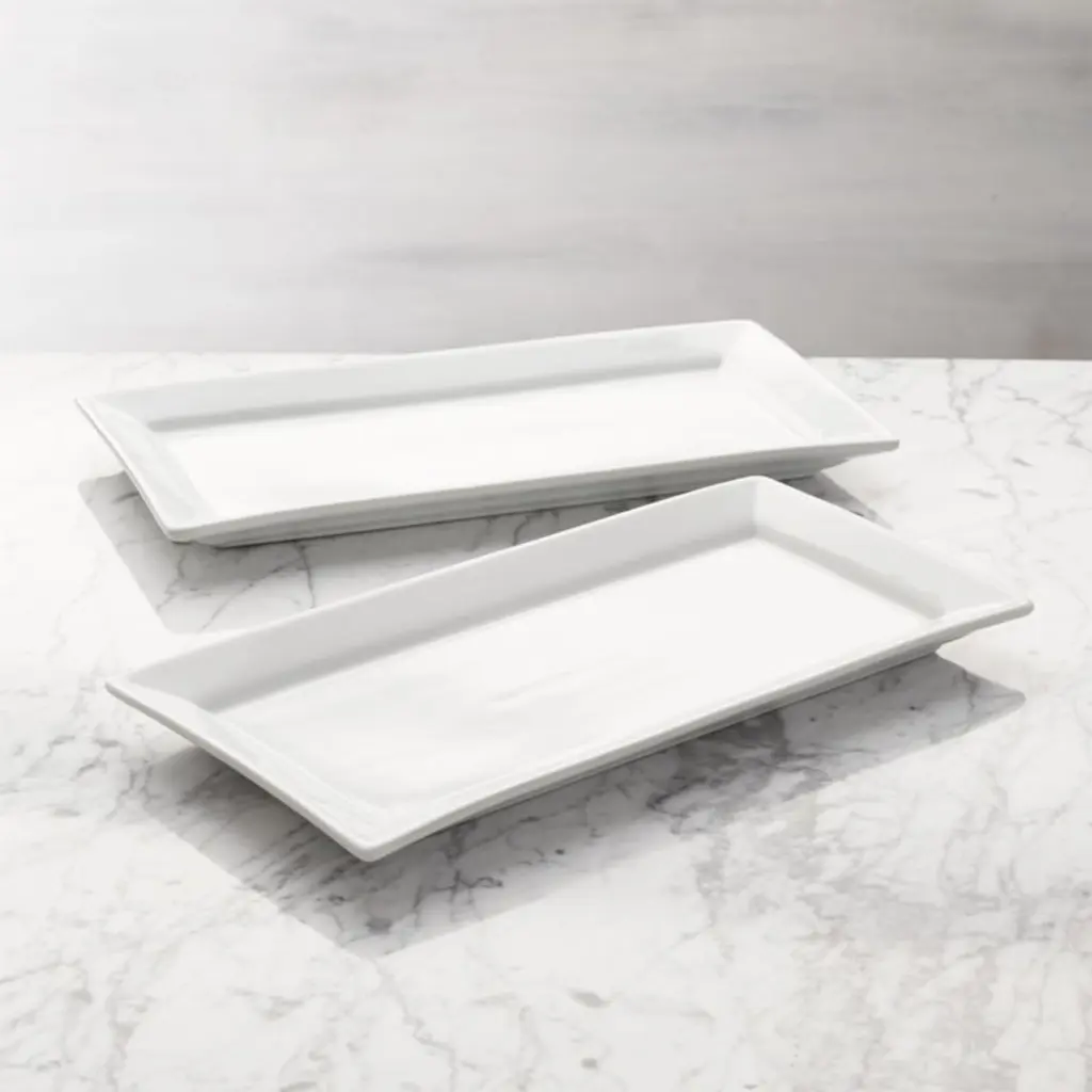 Flared white porcelain rectangles to serve and display at the table or buffet. Designed to nestle in our Cambridge Two-Tier Server, this pair of thick, durable serving plates is dishwasher safe for quick cleanup after dinner parties and brunches.