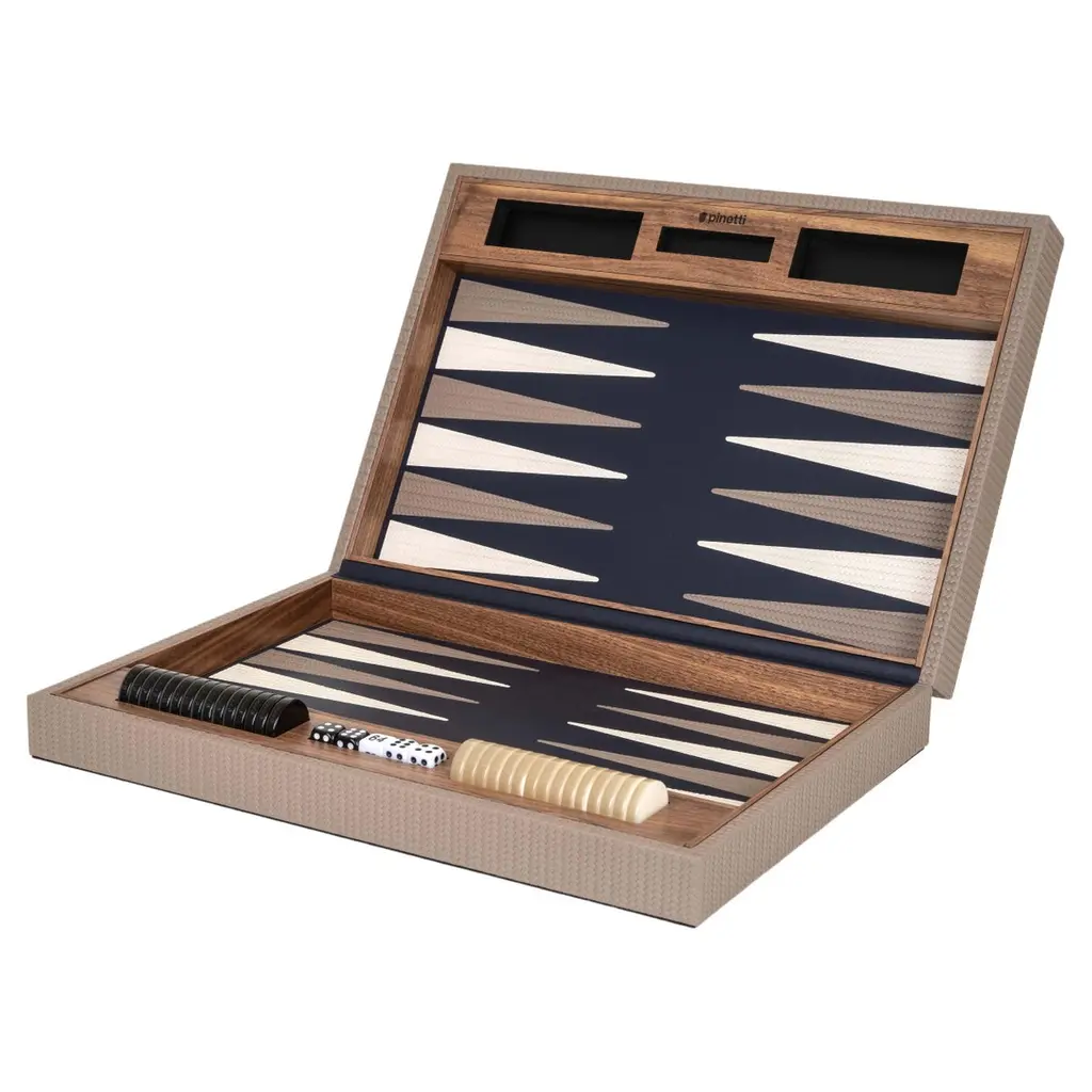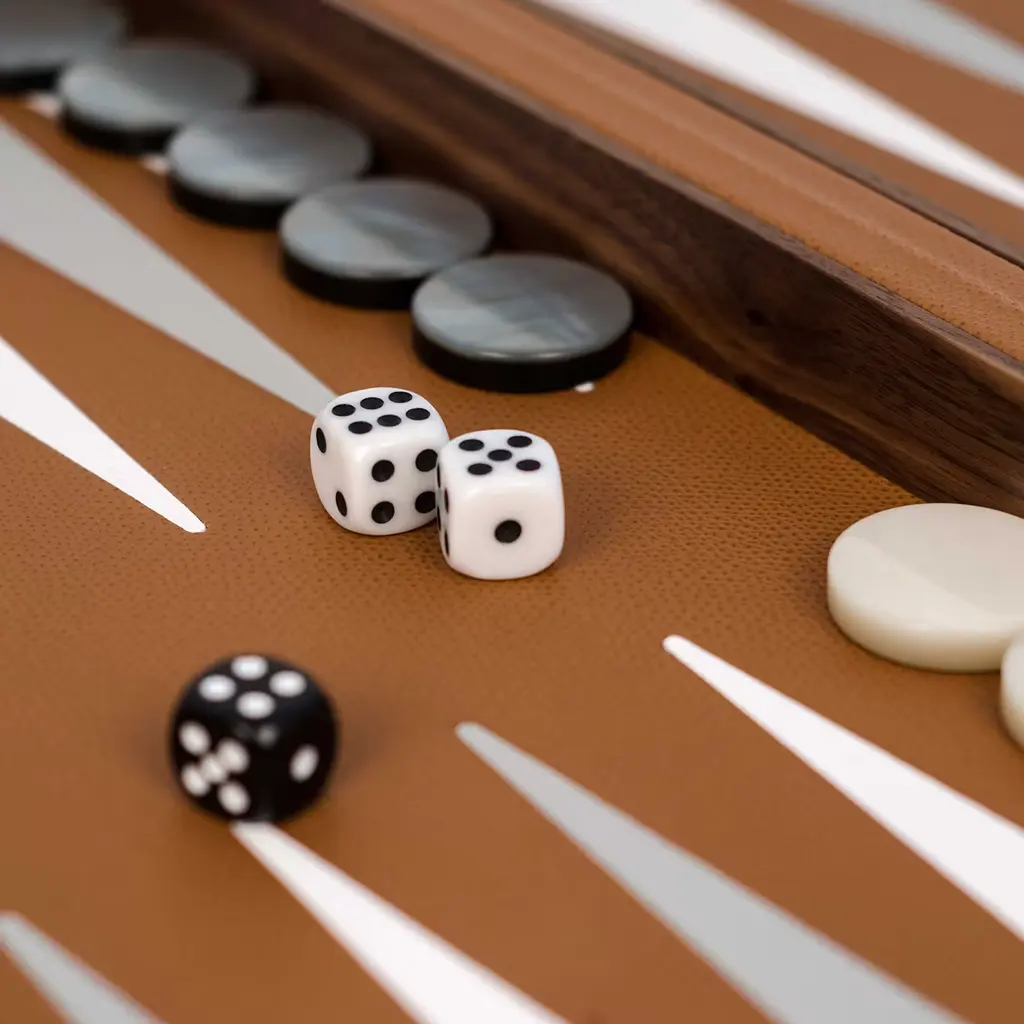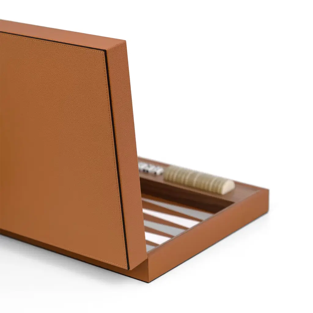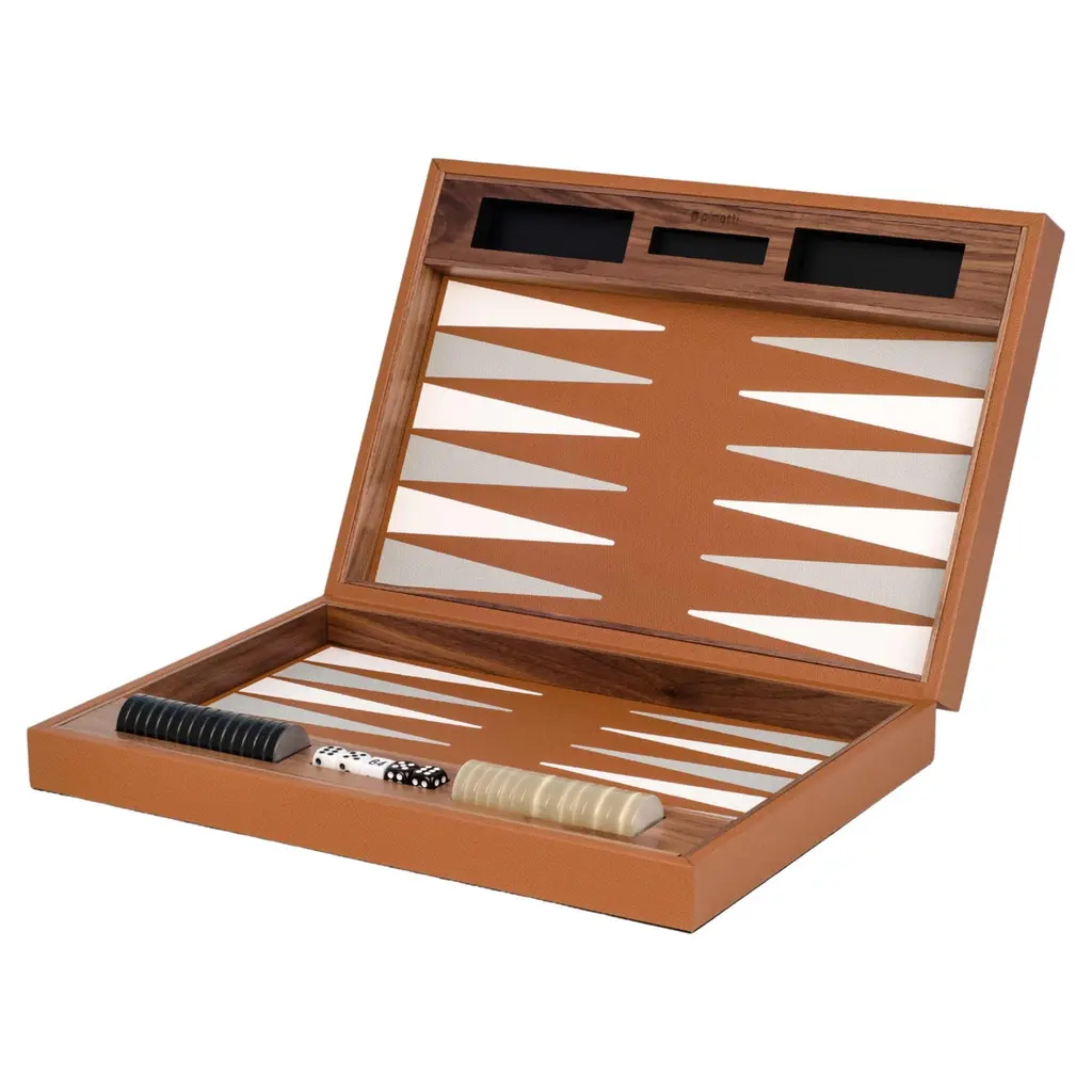 A refined take on a timeless classic, this Backgammon board game is handcrafted of first-rate materials. Fashioned of walnut wood, it is enriched with camel-colored leather upholstery enhanced with white and light gray details, covering both inside and outside. Also available in a cream version with dove gray and coffee brown details, and a navy blue and dove gray version. Please consult the Artemest catalog for details.