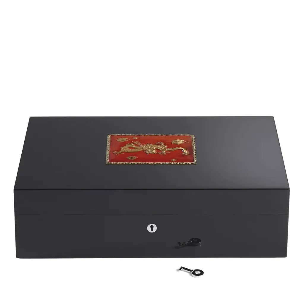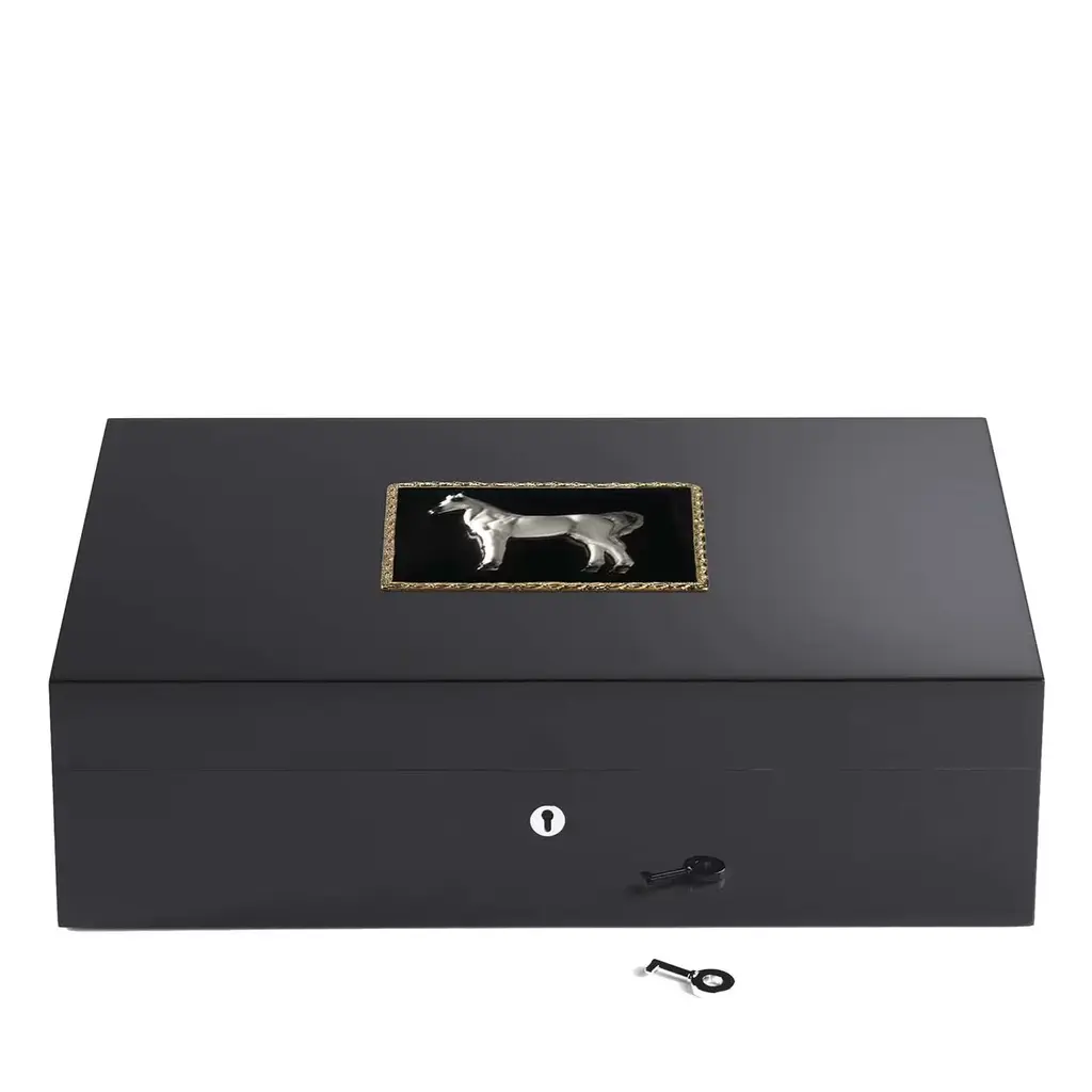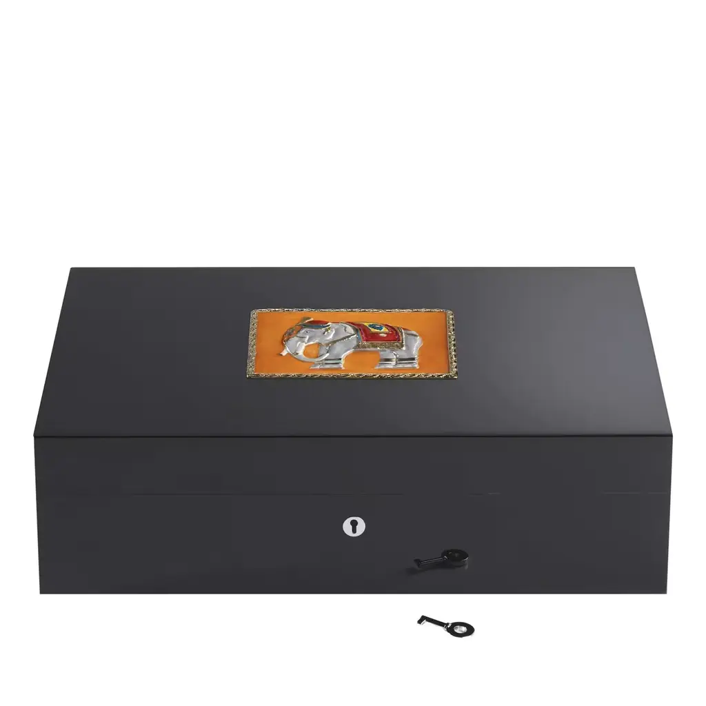 An exquisite example of Italian craftsmanship, this wooden humidor boasts a square decoration on the lid portraying a finely depicted camel on a blue background. The golden edges framing the decoration share with the camel the same luminous finish. Containing up to 110 cigars, this wooden humidor is distinguished by an elegant black silhouette.