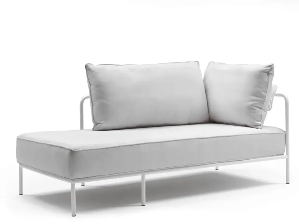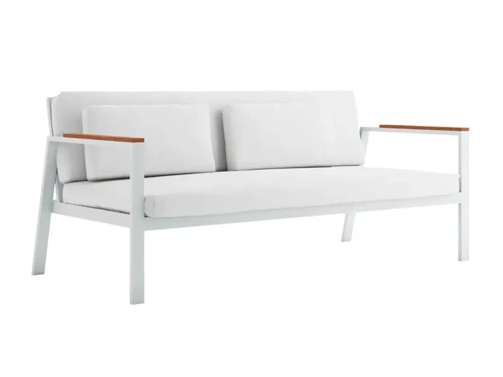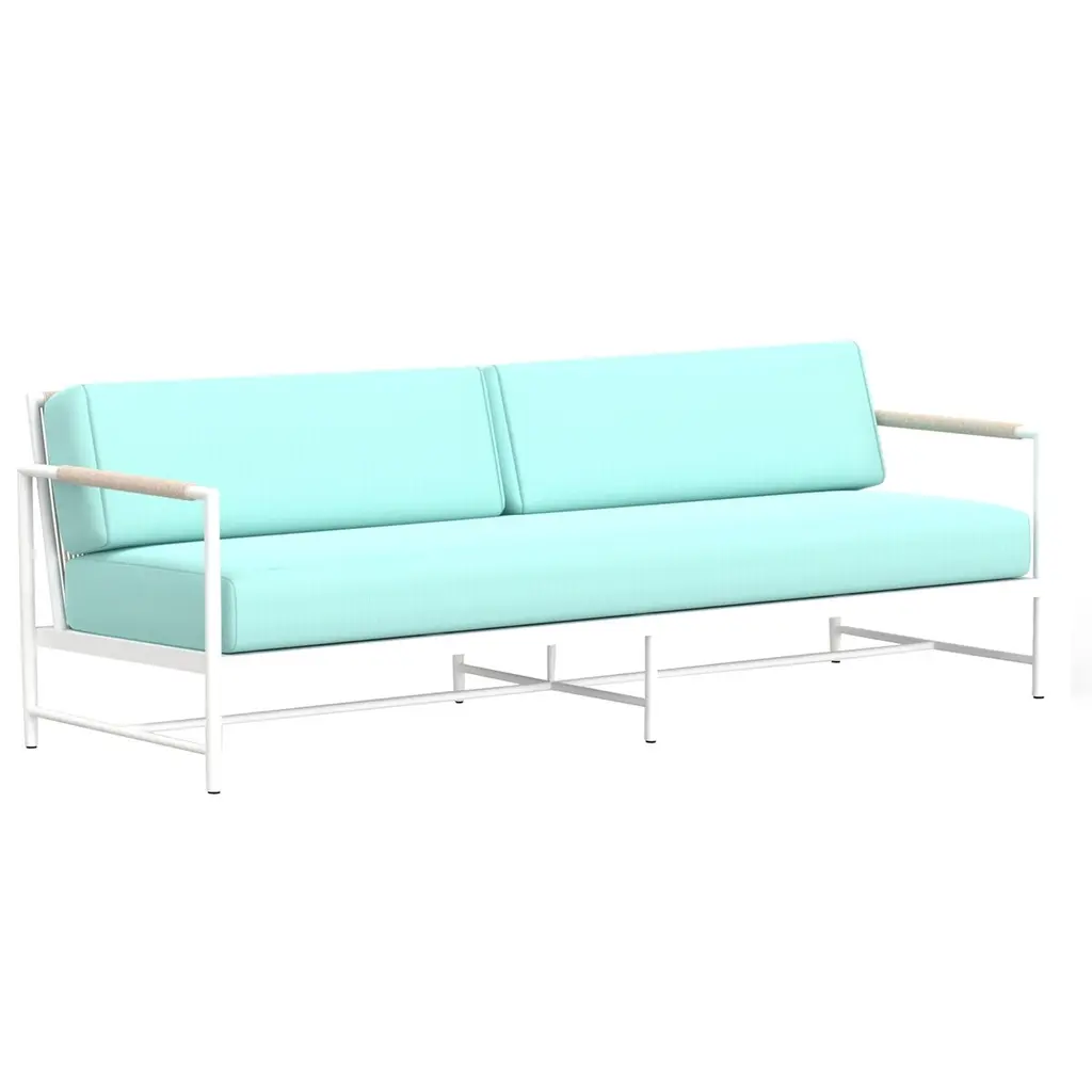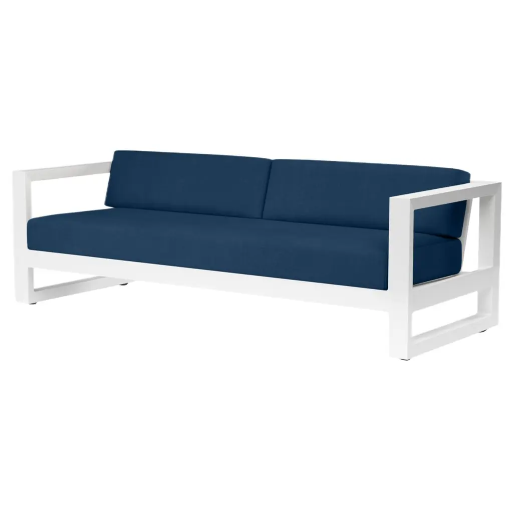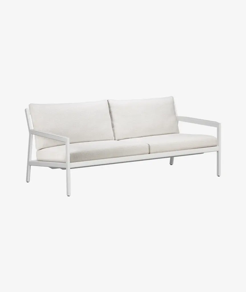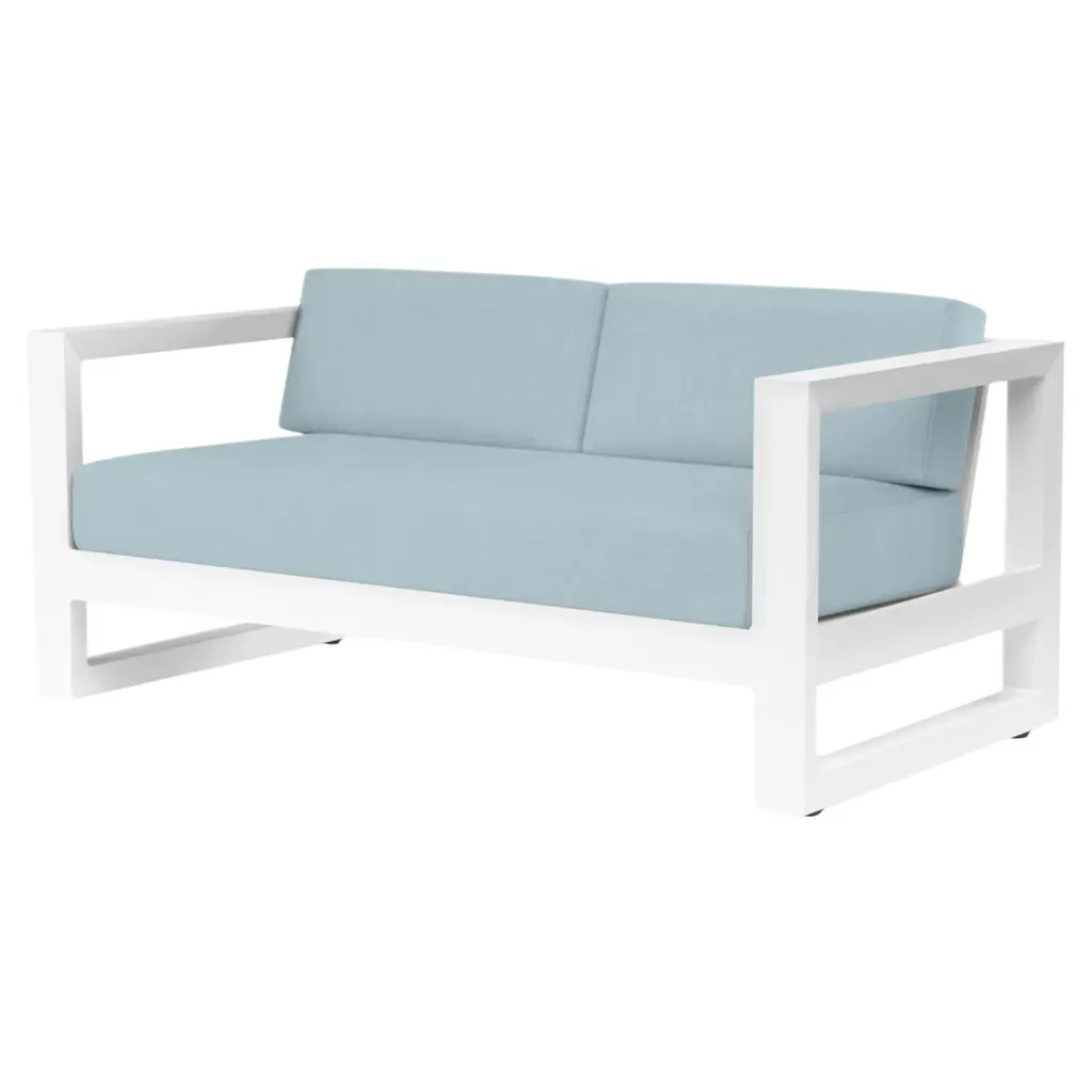 "The Newport Sofa blends modern and industrial sensibility into one striking design. Informed by mid-century design elements, the Newport features a low back and smart, linear frame. Crafted in powder coated aluminum in a Satin White finish. Fully welded, scratch-resistant powder-coated aluminum frame Weather resistant, high-resiliency foam cushions Stocked in Premium Sunbrella fabric in Cast Silver Adjustable Non-Marring Feet Commercial Quality Construction Custom Cushions available in approx. 4 weeks. Newport is part of the Frost color story, and coordinates well with Miami, Naples, and Carrara pieces from the Bazaar."
