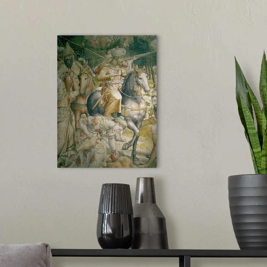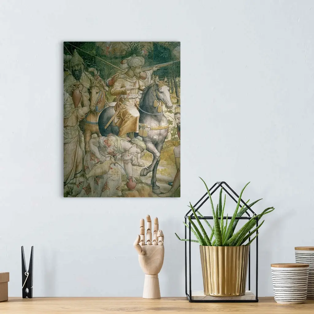 XAM77339 Campaign of Emperor Charles V against the Turks at Tunis in 1535: the defeat of the Turks at the battle of Goletta, detail of cavalrymen quenching their thirst, cartoon for a tapestry (charcoal and w/c on paper); by Vermeyen, Jan Cornelisz (1500-59); charcoal and watercolour on paper; Kunsthistorisches Museum, Vienna, Austria; Netherlandish, out of copyright